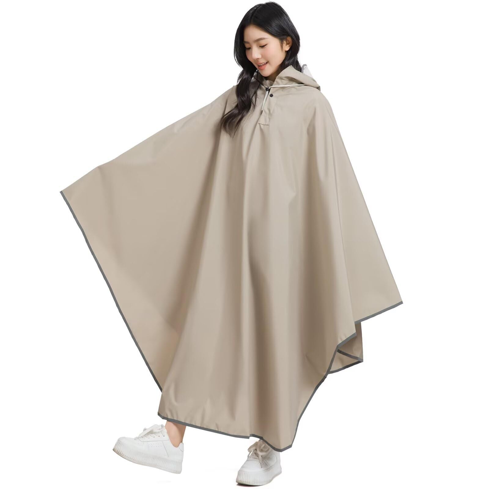 【快適設計のこだわり】広め裾で通気性バツグン!ポンチョ型ならではの立体構造で、蒸れを軽減。リュック対応設計に加え、3WAY調整可能フード(ドローコード/留めボタン/マジックテープ)でピタリフィット。超軽量&収納袋付きで、突然の雨も安心。