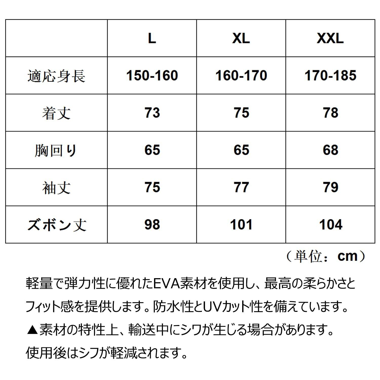 【軽量・防水・ムレ軽減】EVA素材の採用で、動きやすく快適な着心地です。EVA雨衣は、その素材の特性から、軽量性、柔軟性、耐久性、そして環境への配慮(低ダイオキシン発生)といった利点があります。PVC雨具と比較して耐摩耗性に優れるEVA素材は、長期間使用しても劣化しにくい傾向があります。零下でもひび割れを起こしにくいという耐候性も持ち合わせています。