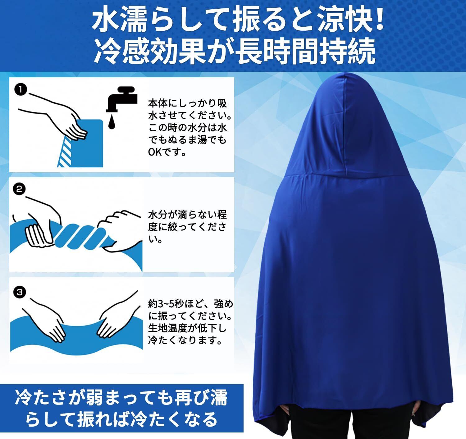 【水濡らして振ると涼快!冷感効果が長時間持続】冷感 ポンチョ 生地に水分が含まれていれば、振るだけで何度でも涼しさが再現されます。涼しさが弱まったように感じる場合は、生地の水分量が減少しているためで、その場合、再度濡らして振ると、何度も涼しさを感じることができます。この手順を繰り返して、数時間にわたって涼しさを保つことができます。