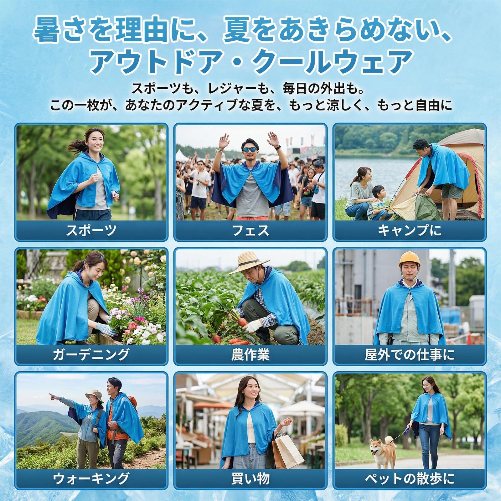 【瞬時にひんやり、快適冷却体験】特殊な接触冷感素材を採用し、水に濡らして絞って振るだけで、生地温度が驚きの-5℃に!炎天下でも瞬時に心地よいひんやり感が広がり、夏の不快な暑さを忘れさせてくれます。まるで冷たいシャワーを浴びたような爽快感を長時間持続。冷感ポンチョ
