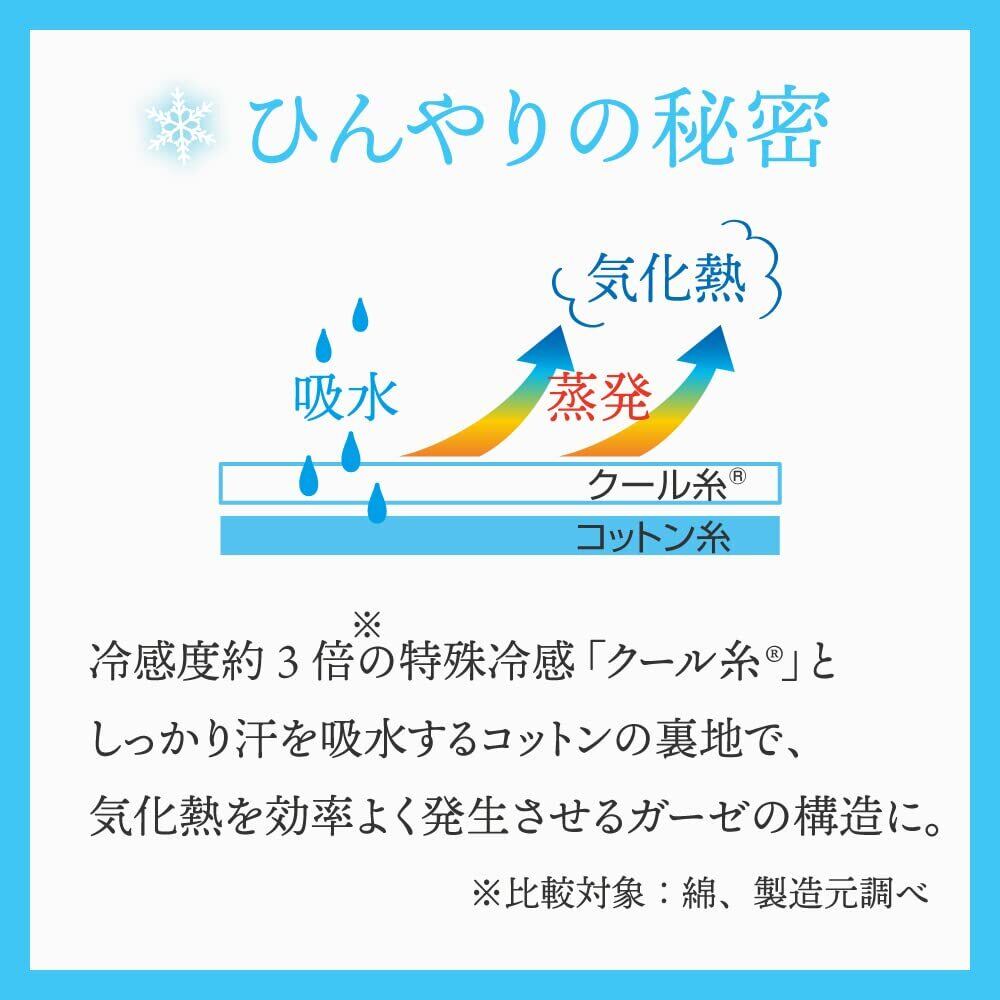 冷感度約3倍の特殊冷感「クール糸(R)」としっかり汗を吸水するコットンの裏地で、気化熱を効率よく発生させるガーゼの構造に。