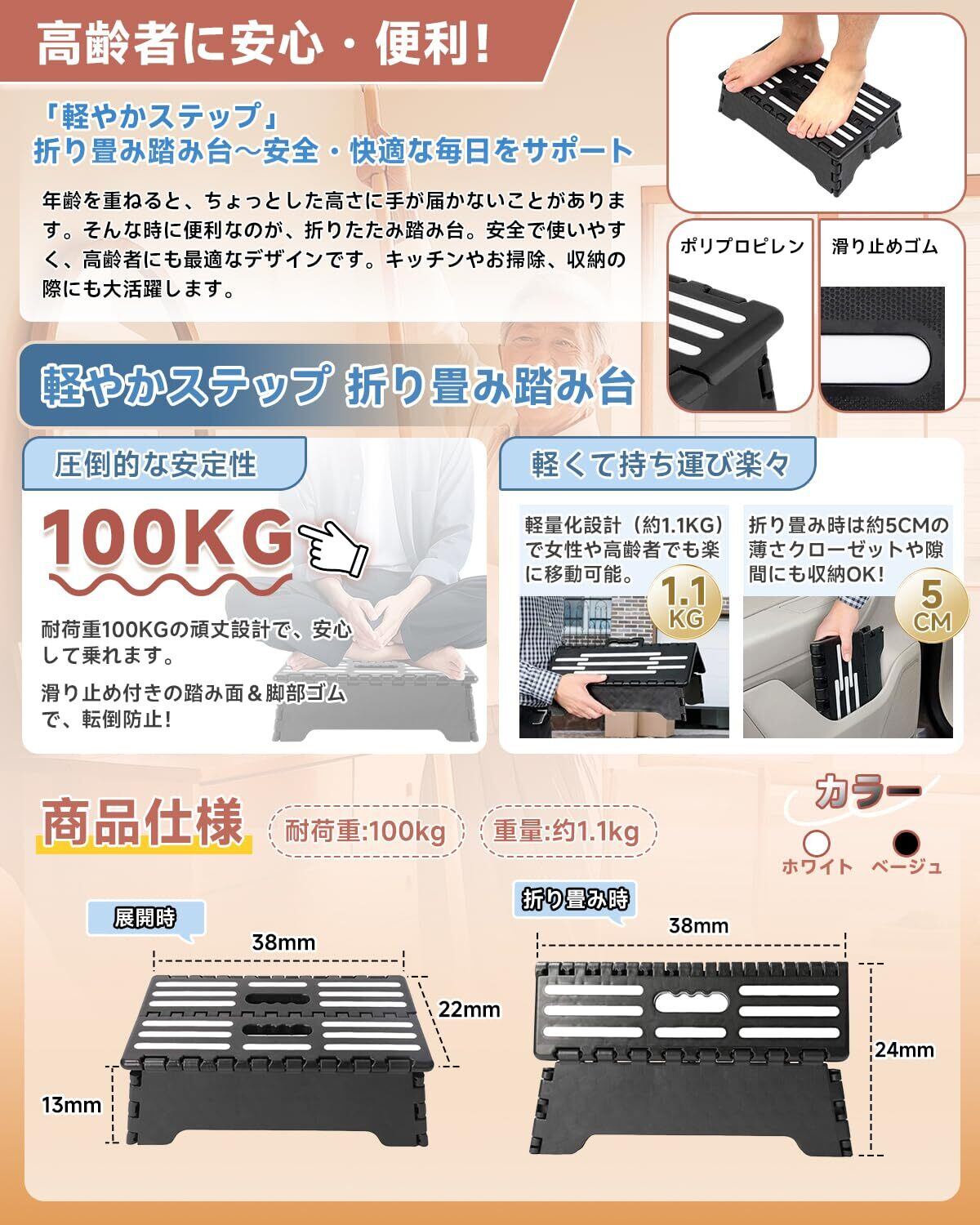 【商品詳細】展開時の寸法:22cm×38cm×13cm、折りたたみ時の寸法:39.5cm×5cm×24cm。重量:1.1kg、耐荷重:100kg。