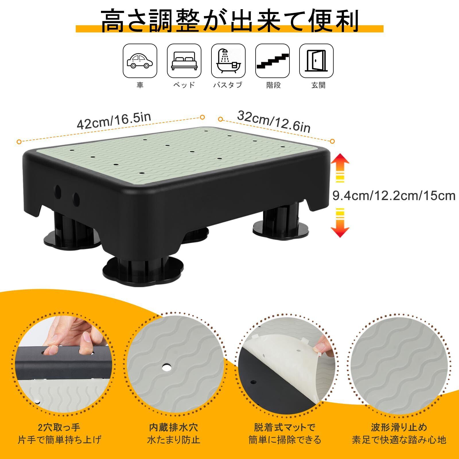 【高さ3段階調整】踏み台の高さが9.4cmと12.2cmと15cm、高齢者からお子様、ペット、室内外を問わず多様なシーンでお使いいただけます。浴室での安全確保、ベッドサイドの補助、車の乗り降り、アウトドアでのステップサポートなどに最適です。