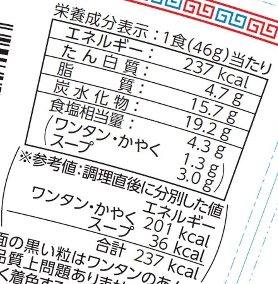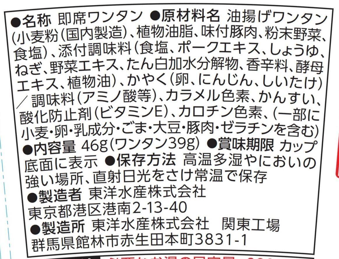 油揚げワンタン(小麦粉(国内製造)、植物油脂、味付豚肉、粉末野菜、食塩)、添付調味料(食塩、しょうゆ、ポークエキス、ねぎ、野菜エキス、たん白加水分解物、香辛料、酵母エキス、植物油)、かやく(卵、にんじん、しいたけ)/調味料(アミノ酸等)、カラメル色素、