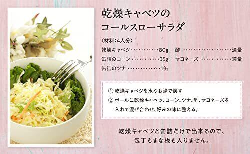 【戻し方】 ・お味噌汁、カップラーメン、その他の汁物には、お鍋にそのまま入れるだけです。 ・乾燥キャベツを熱湯で約2分、水で約10分戻してください。戻りましたら、よく水気を切ってお料理にお使いください。戻さずそのままお使いいただく事も出来ますが、軽くすすいでお使い頂きますとより一層美味しくお召し上がり頂けます。