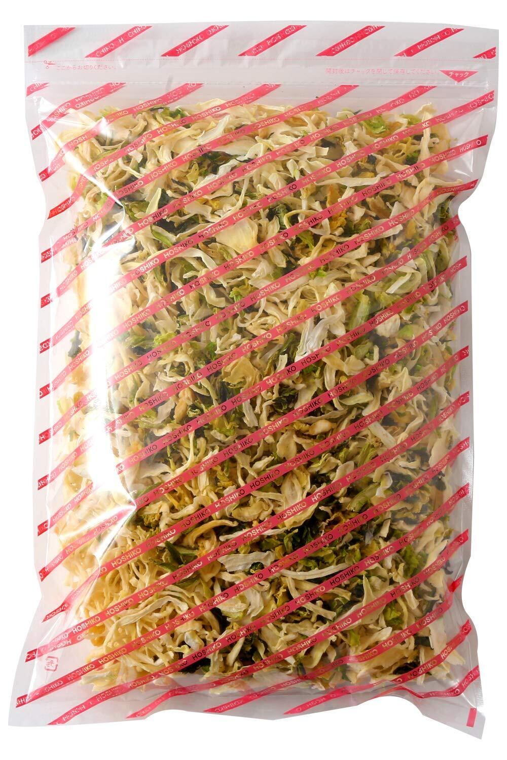 【商品特徴】九州産の玉ねぎ、キャベツ、小松菜、白菜の4種類をブレンド。白菜と小松菜がシャキッ!安心とおいしさのために「塩なし・添加物なし・ぶどう糖不使用」で、戻し汁ごと使えます。水から加えればだしを使わなくても野菜のだしが美味しい味噌汁になります。