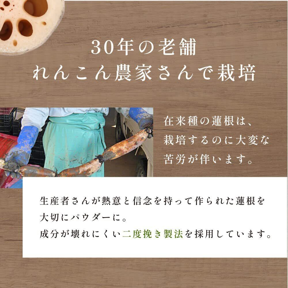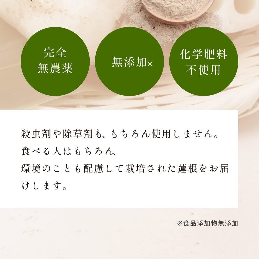 原料である蓮根は、熊本県産のもののみを使用。自然本来の味を楽しんでほしいという思いから、品種改良や海外からの品種は使用せず、熊本県産の有機れんこんだけを使って製造しています。こだわりの有機れんこんを栽培してくれているのは、この道30年のれんこん農家。通常よりも栽培が難しい有機れんこんは、生産者さんが熱意と信念をもって作り上げた貴重なもの。その蓮根を、成分が壊れないように二度挽き製法でパウダー化しています。
