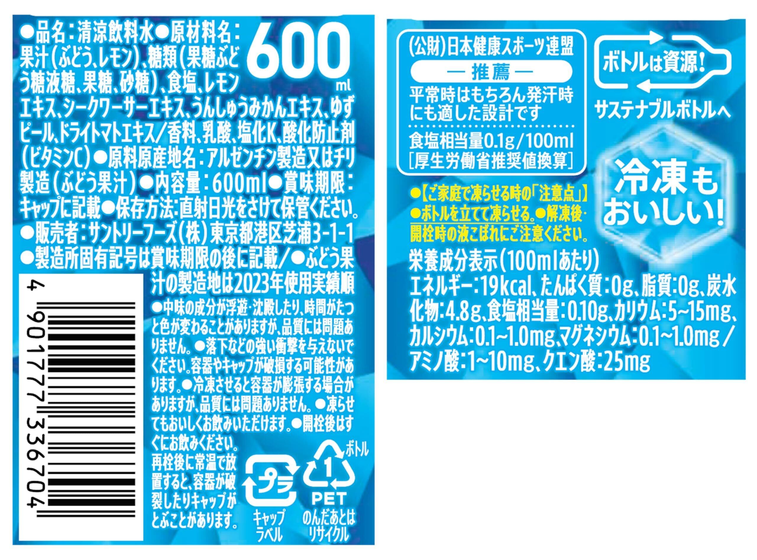 原材料:果汁(ぶどう、レモン)、糖類(果糖ぶどう糖液糖、果糖、砂糖)、食塩、レモンエキス、シークワーサーエキス、うんしゅうみかんエキス、ゆずピール、ドライトマトエキス/香料、乳酸、塩化K、酸化防止剤(ビタミンC)