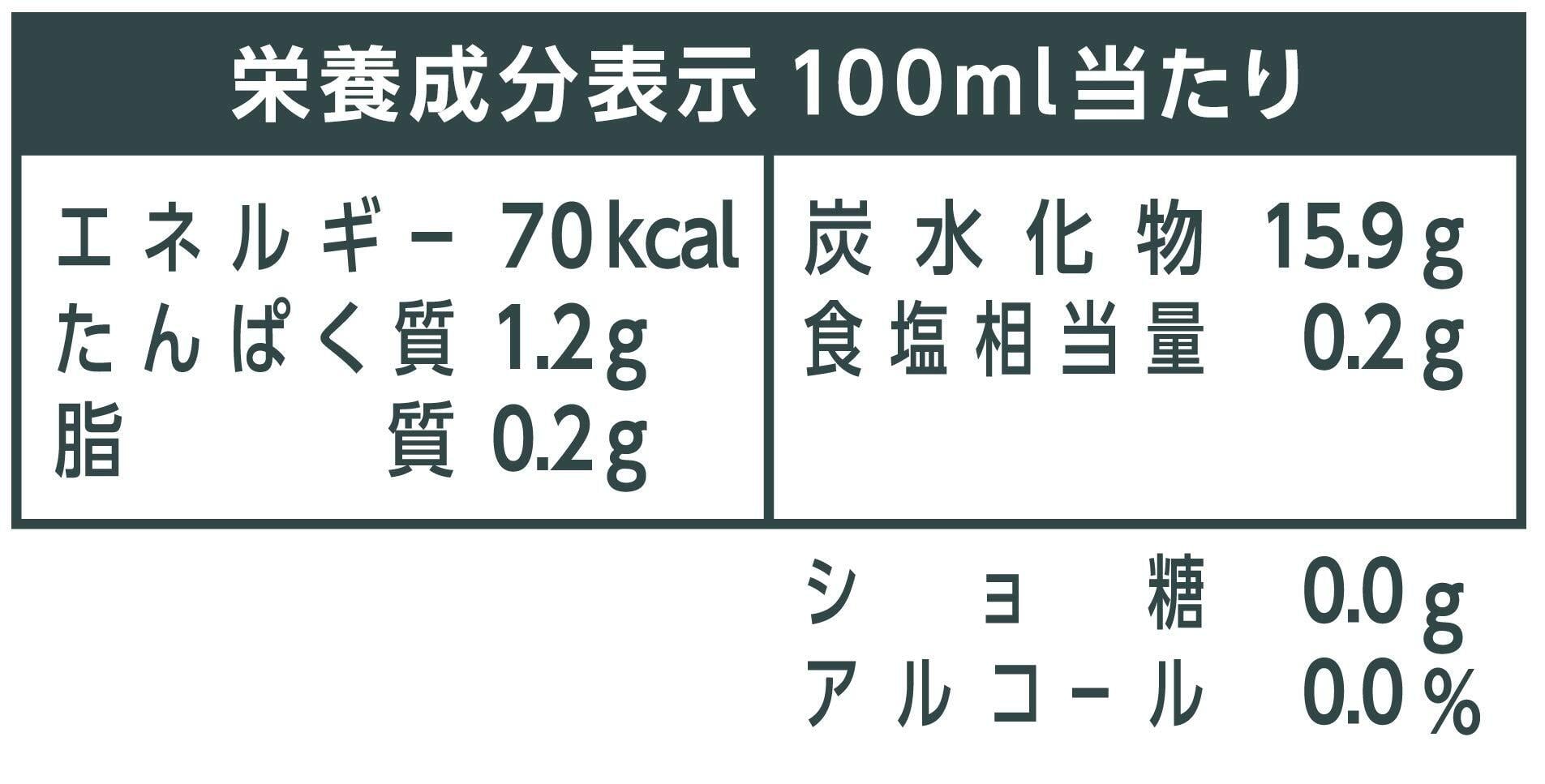 100ml当たり:エネルギー75kcal、たんぱく質1.4g、脂質0.2g、炭水化物16.9g(糖質16.7g、食物繊維0.2g)、食塩相当量0.2g 【ショ糖0.0g、アルコール0.0%】