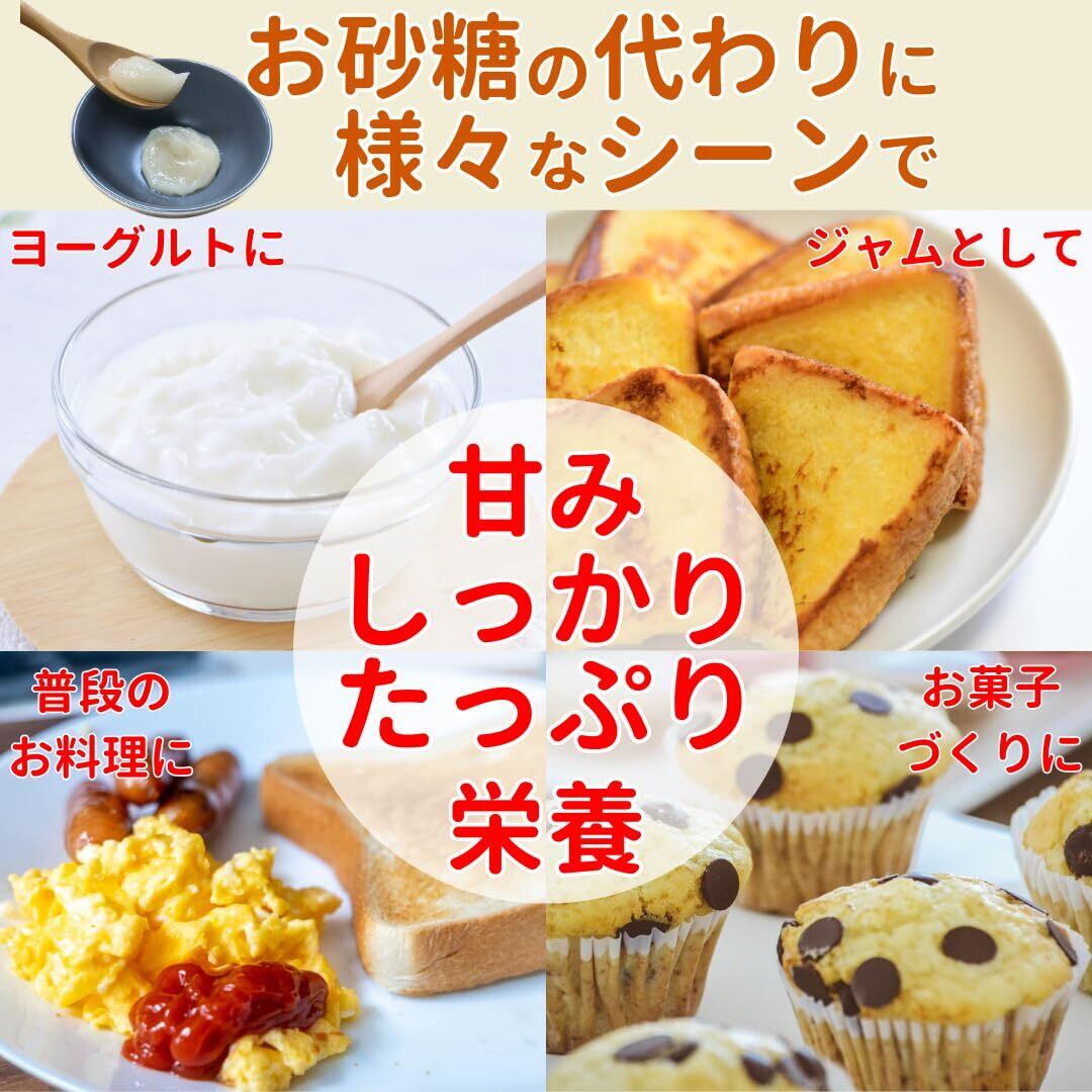 砂糖の代わりにご使用ください。甘味がまろやかで、やさしい甘さです。砂糖の約60%の糖度です。糖分の気になる方におすすめします。 ヨーグルトに混ぜたり、パンに塗っても美味しくいただけます。
