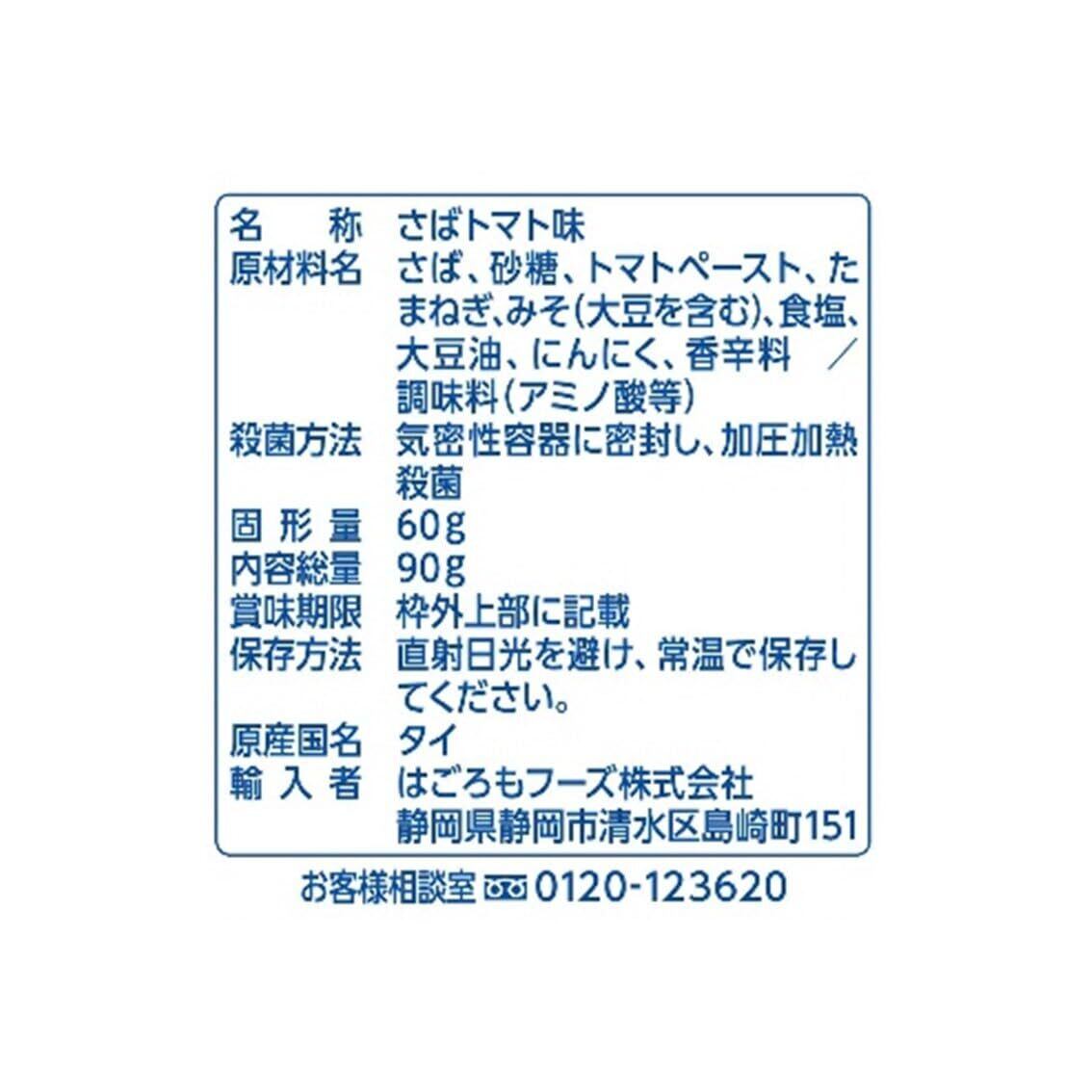原材料:さば、砂糖、トマトペースト、たまねぎ、みそ(大豆を含む:遺伝子組換えでない)、大豆油、食塩、おろしにんにく、香辛料 / 調味料(アミノ酸等)