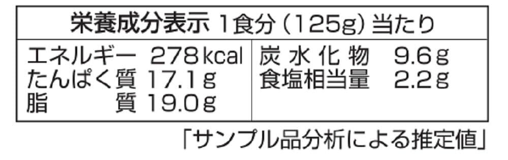 鶏肉、大豆油、バジル、にんにく、粒状大豆たん白、砂糖、ナンプラー、しょうゆ、唐辛子、食塩、オイスターエキスパウダー/調味料(アミノ酸等)、加工デンプン、(一部に小麦・大豆・鶏肉を含む)