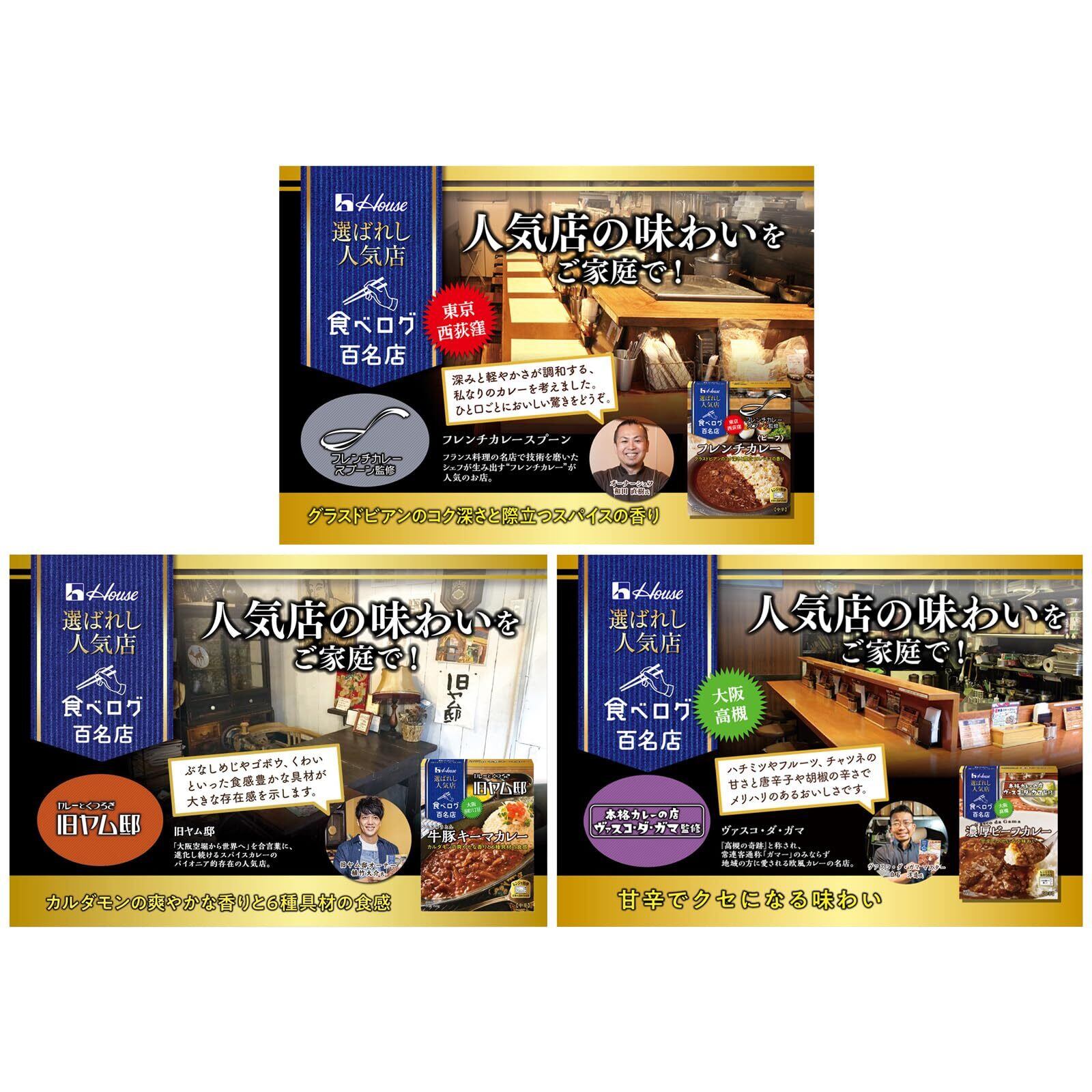 【芳醇チキン】 鶏肉、トマト・ピューレーづけ、ソテーオニオン、牛脂豚脂混合油、しょうがペースト、ガーリックペースト、でんぷん、乾燥玉ねぎ、カレーパウダー、食塩、コーングリッツ、チキンエキス、ブラウンマスタード、調味ローストガーリックペースト、砂糖、ローストクミン、クミン、クローブ、発酵調味料、酵母エキス、シナモン、ブラックペパー、焙煎唐がらし/調味料(アミノ酸等)、増粘剤(加工デンプン)、乳化剤、香辛料抽出物、パプリカ色素、香料、酸味料、(一部に乳成分・小麦・大豆・鶏肉・豚肉を含む)【欧風ビーフ】牛肉、チーズ、小麦粉、バナナピューレ、ソテーオニオン、植物油脂、りんごペースト、ソテー香味野菜ペースト、チャツネ、トマトペースト、砂糖、フォン・ド・ボー調味料、クミン、食塩、カレーパウダー、オールスパイス、しょうがペースト、みそ、でんぷん、コーヒーエキス、クローブ、カルダモン、焙煎唐がらし、唐がらし/調味料(アミノ酸等)、着色料(カラメル、パプリカ色素)、乳化剤、香料、酸味料、香辛料抽出物、(一部に乳成分・小麦・牛肉・大豆・鶏肉・バナナ・豚肉・りんごを含む) 【濃厚バターチキン】 鶏肉、生クリーム、植物油脂クリーム、ホワイトルウ、トマトペースト、りんご繊維、砂糖、全粉乳、パーム油、でんぷん、酵母エキス、食塩、焙煎香辛料ペースト、チキンエキス、しょうがペースト、ガーリックペースト、チーズパウダー、香辛料、調味油、焙煎フェヌグリーク/調味料(アミノ酸等)、乳化剤、酸化防止剤(ビタミンE、ビタミンC)、香料、酸味料、香辛料抽出物、(一部に乳成分・小麦・大豆・鶏肉・りんごを含む) 【スパイス織りなすビーフカレー】 牛肉、砂糖混合ぶどう糖果糖液糖、ソテーオニオン、牛脂豚脂混合油、小麦粉、砂糖、トマトペースト、ソテー香味野菜ペースト、乾燥玉ねぎ、みそ、牛脂、ガーリックペースト、食塩、おからパウダー、カレーパウダー、ブラウンマスタード、でんぷん、カルダモン、クミン、ターメリック、クローブ、ビーフエキス、オニオンパウダー、玉ねぎ調味料、酵母エキス加工品、コリアンダー、ブラックペパー、焙煎フェヌグリーク、ガーリックパウダー、ぶどう糖、フェヌグリークリーフ、スターアニス、唐がらし/調味料(アミノ酸等)、カラメル色素、増粘剤(加工デンプン)、乳化剤、酸化防止剤(ビタミンE)、酸味料、香料、(一部に小麦・牛肉・大豆を含む) 【フレンチ】 牛肉、なたね油、乾燥玉ねぎ、トマトペースト、みそ、砂糖混合ぶどう糖果糖液糖、チャツネ、しょうがペースト、グラスドビアン、しょうが加工品、牛脂、食塩、ガーリックペースト、ブラウンマスタード、赤ワイン、ブラックペパー、クミン、でんぷん、カルダモン、タイム、ホワイトペパー、スターアニス、クローブ、唐がらし/増粘剤(加工デンプン)、調味料(アミノ酸等)、カラメル色素、酸味料、酸化防止剤(ビタミンE)、香辛料抽出物、(一部に牛肉・大豆・鶏肉・ゼラチンを含む) 【牛豚キーマカレー】 食肉(牛肉、豚肉)、野菜(ぶなしめじ、ごぼう、赤ピーマン、みずくわい)、ソテーオニオン、こんにゃく、牛脂豚脂混合油、みそ、焙煎香辛料ペースト、トマトペースト、砂糖、しょう油、ガーリックペースト、香味油、カルダモン、ブラウンマスタード、チキンブイヨン、クミン、コリアンダー、ターメリック、食塩、ローストクミン、クローブ、かつおぶし粉末、こんぶエキス、焙煎唐がらし、タイム、ナツメグ、ブラックペパー/増粘剤(加工デンプン)、調味料(アミノ酸)、乳化剤、水酸化Ca、香料、(一部に小麦・牛肉・大豆・鶏肉・豚肉を含む) 【濃厚ビーフ】 牛肉、ソテーオニオン、小麦粉、加工はちみつ、りんご濃縮果汁、フルーツチャツネ、植物油脂、マンゴーピューレ、りんごペースト、チキンブイヨン、チャツネ、カレーパウダー、食塩、乾燥玉ねぎ、しょう油、にんじん濃縮汁、ゼラチン、トマトペースト、ウスターソース、でんぷん、ガーリックペースト、おからパウダー、酵母エキス、オレンジ濃縮果汁、香辛料、焙煎唐がらし/調味料(アミノ酸等)、増粘剤(加工デンプン)、カラメル色素、乳化剤、酸化防止剤(ビタミンE)、酸味料、香辛料抽出物、香料、(一部に小麦・オレンジ・牛肉・大豆・鶏肉・バナナ・豚肉・りんご・ゼラチンを含む) *他製品情報は裏面画像でご確認ください。