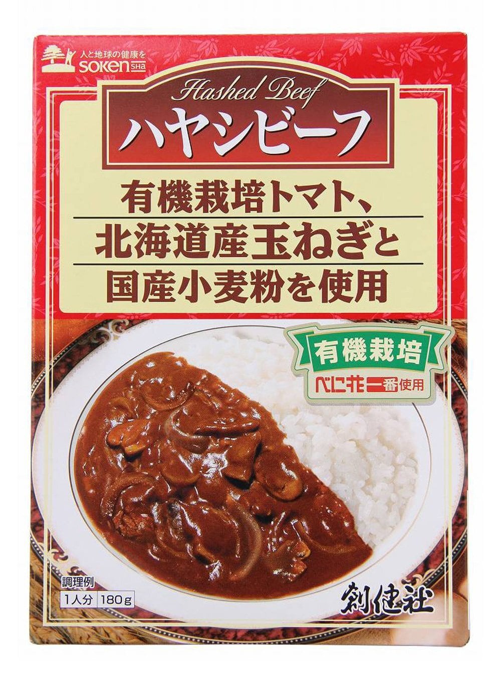 創健社 ハヤシビーフ(レトルト) 180gは、有機栽培べに花油、有機栽培トマト、国内産小麦粉、北海道産玉ねぎ、沖縄県産粗糖等を使用。本格洋食店のおいしさが手軽に味わえるレトルトのハヤシビーフ。召し上がり方・使い方: ○中袋をそのまま熱湯の中に入れ、3~5分間よく温めてからお召し上がりください。 ○電子レンジで温めるときは、封を切って必ず他の器に移し替え、ラップをかけて温めてください。