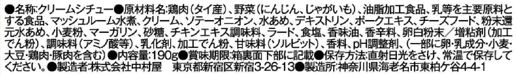 鶏肉(タイ産)、野菜(にんじん、じゃがいも)、油脂加工食品、乳等を主要原料とする食品、マッシュルーム水煮、クリーム、ソテーオニオン、水あめ、デキストリン、ポークエキス、チーズフード、粉末還元水あめ、小麦粉、マーガリン、砂糖、チキンエキス調味料、ラード、食塩、 香味油、香辛料、卵白粉末/増粘剤(加工でん粉)、調味料(アミノ酸等)、乳化剤、加工でん粉、甘味料(ソルビット)、香料、pH調整剤、(一部に卵・乳成分・小麦・大豆・鶏肉・豚肉を含む)