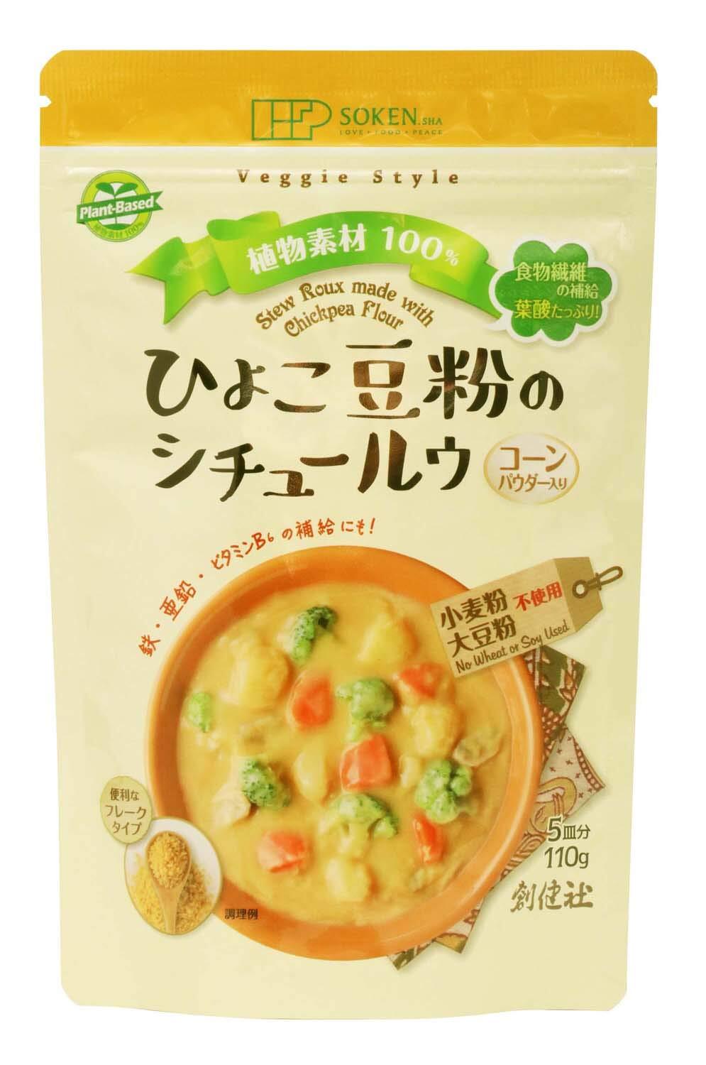 小麦粉の代わりにひよこ豆粉を使い、植物素材のみで仕上げたフレークタイプのシチュールウ。コーンパウダー入り。「乳」原料は勿論、動物性原料は一切使わない「プラントベース(植物素材100%)」商品です。ひよこ豆を使ったことで自然の葉酸がたっぷり含まれており、食物繊維・鉄・亜鉛・ビタミンB6の補給にもおすすめです。その他、原材料には化学溶剤を使わずに圧搾法でしぼった有機べに花油を使用しており、化学調味料、香料などの不要な合成添加物は使用しておりません。1袋で5皿分。