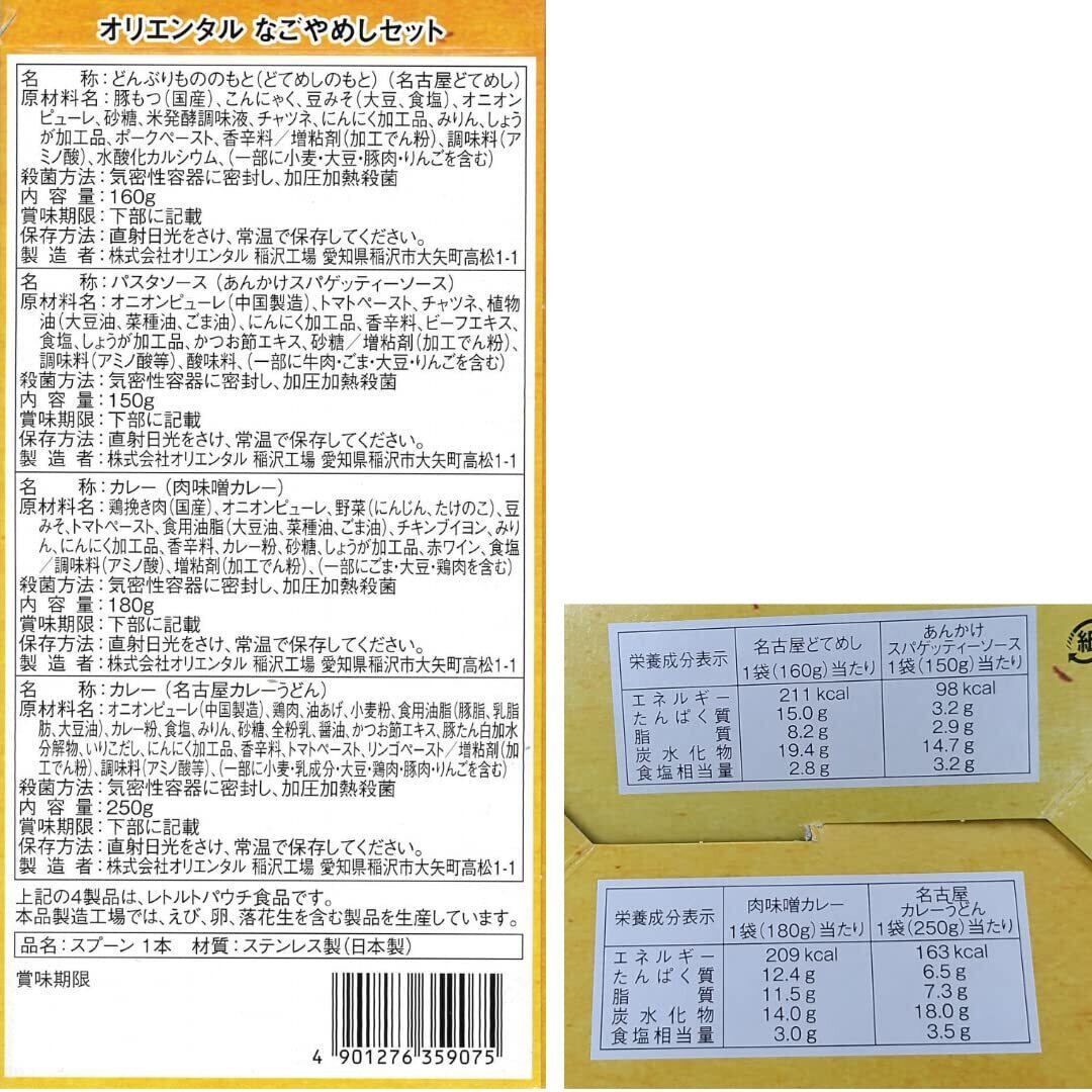豚もつ(国産)、こんにゃく、豆みそ(大豆、食塩)、オニオンピューレ、砂糖、米発酵調味液、チャツネ、にんにく加工品、みりん、しょうが加工品、ポークペースト、香辛料/増粘剤(加工でん粉)、調味料(アミノ酸)、水酸化カルシウム、(一部に小麦・大豆・豚肉・りんごを含む)、オニオンピューレ(中国製造)、トマトペースト、チャツネ、植物油(大豆油、菜種油、ごま油)、にんにく加工品、香辛料、ビーフエキス、食塩、しょうが加工品、かつお節エキス、砂糖/増粘剤(加工でん粉)、調味料(アミノ酸等)、酸味料、(一部に牛肉・ごま・大豆・りんごを含む)、鶏挽き肉(国産)、オニオンピューレ、野菜(にんじん、たけのこ)、豆みそ、トマトペースト、食用油脂(大豆油、菜種油、ごま油)、チキンブイヨン、みりん、にんにく加工品、香辛料、カレー粉、砂糖、しょうが加工品、赤ワイン、食塩/調味料(アミノ酸)、増粘剤(加工でん粉)、(一部にごま・大豆・鶏肉を含む)、オニオンピューレ(中国製造)、鶏肉、油あげ、小麦粉、食用油脂(豚脂、乳脂肪、大豆油)、カレー粉、食塩、みりん、砂糖、全粉乳、醤油、かつお節エキス、豚たん白加水分解物、いりこだし、にんにく加工品、香辛料、トマトペースト、リンゴペースト/増粘剤(加工でん粉)、調味料(アミノ酸等)、(一部に小麦・乳成分・大豆・鶏肉・豚肉・りんごを含む)