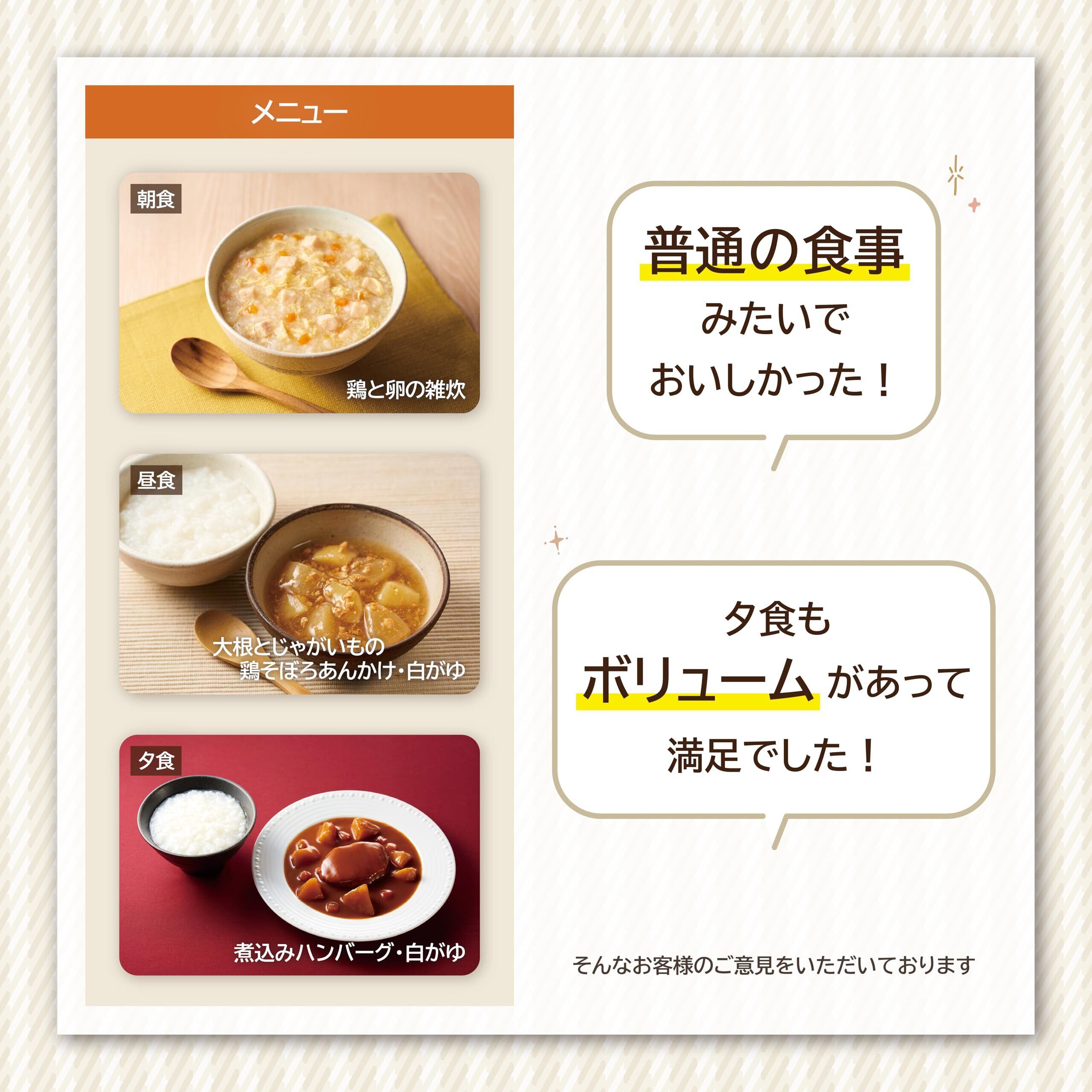 朝食:鶏と卵の雑炊を食べます。昼食:大根とじゃがいもの鶏そぼろあんかけと白がゆを食べます。夕食:煮込みハンバーグと白がゆを食べます。