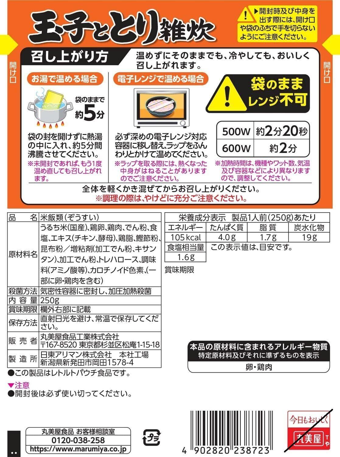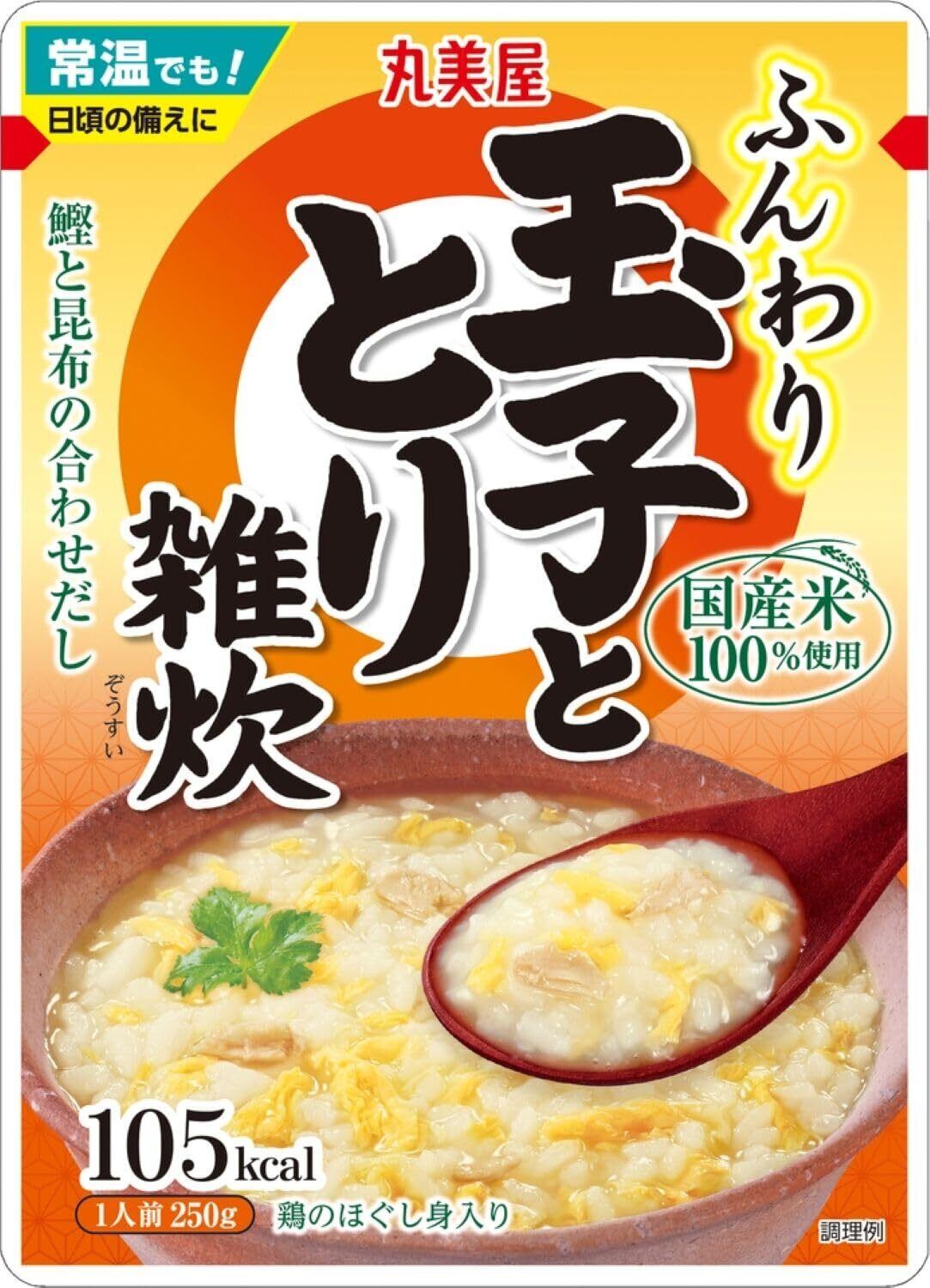うるち米(国産)、鶏卵、鶏肉、でん粉、食塩、エキス(チキン、酵母)、鶏脂、鰹節粉、昆布粉/増粘剤(加工でん粉、キサンタン)、加工でん粉、トレハロース、調味料(アミノ酸等)、カロチノイド色素、(一部に卵・鶏肉を含む)