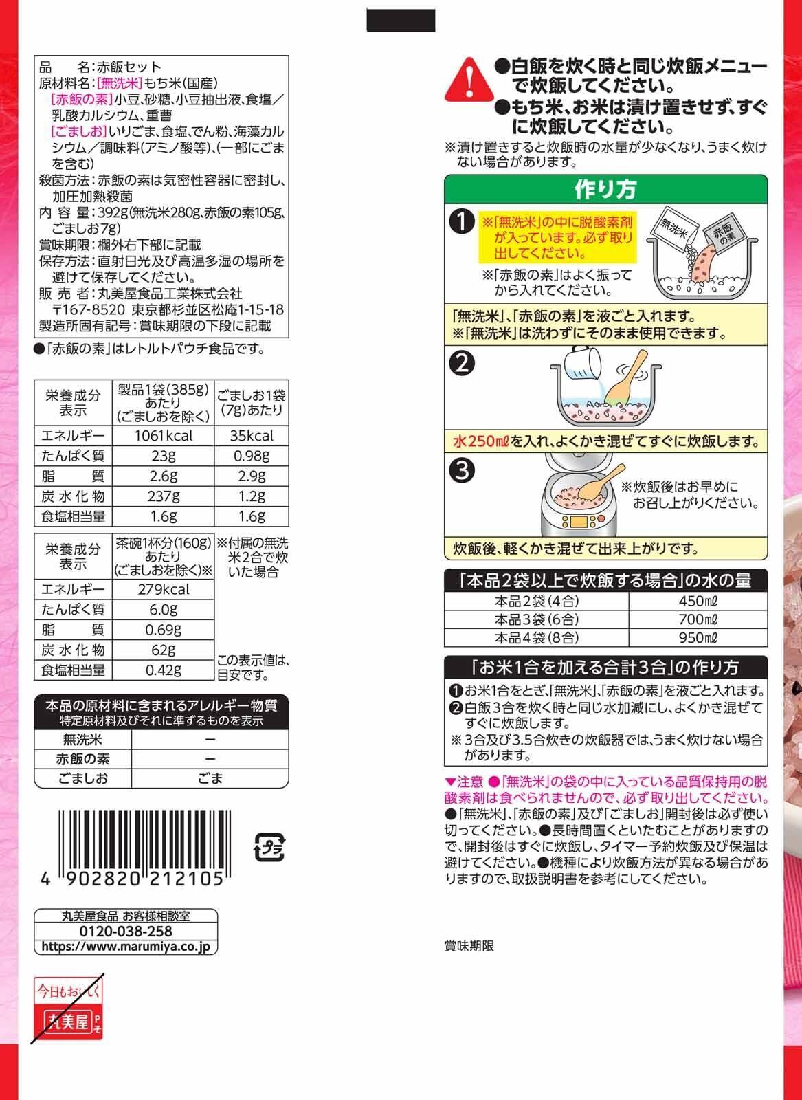 [無洗米]もち米(国産)| [赤飯の素]小豆、砂糖、小豆抽出液、食塩/乳酸カルシウム、重曹| [ごましお]いりごま、食塩、でん粉、海藻カルシウム/調味料(アミノ酸等)、(一部にごまを含む)