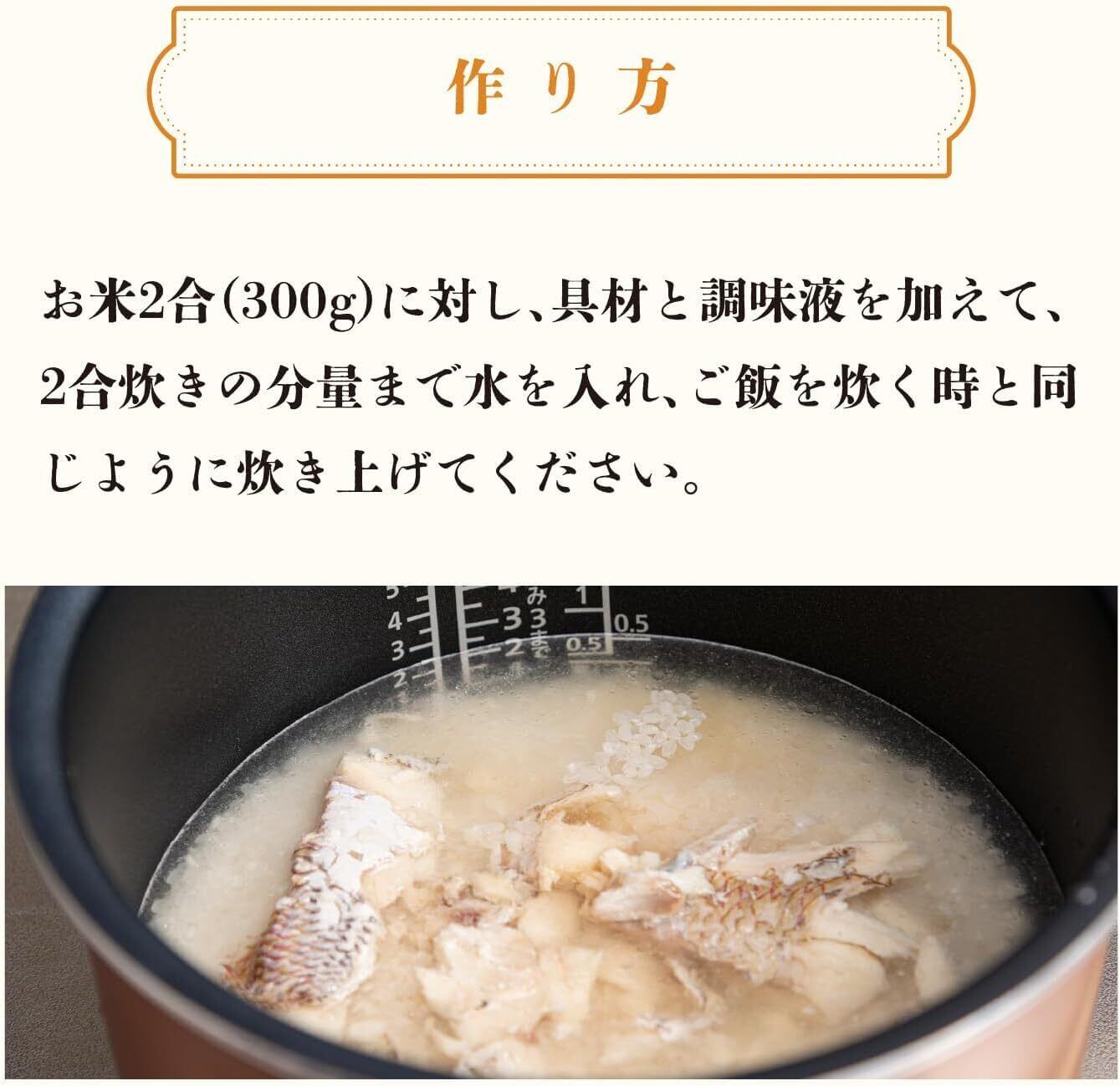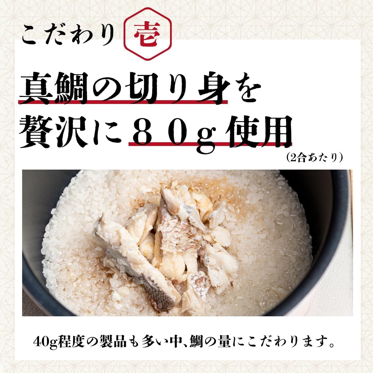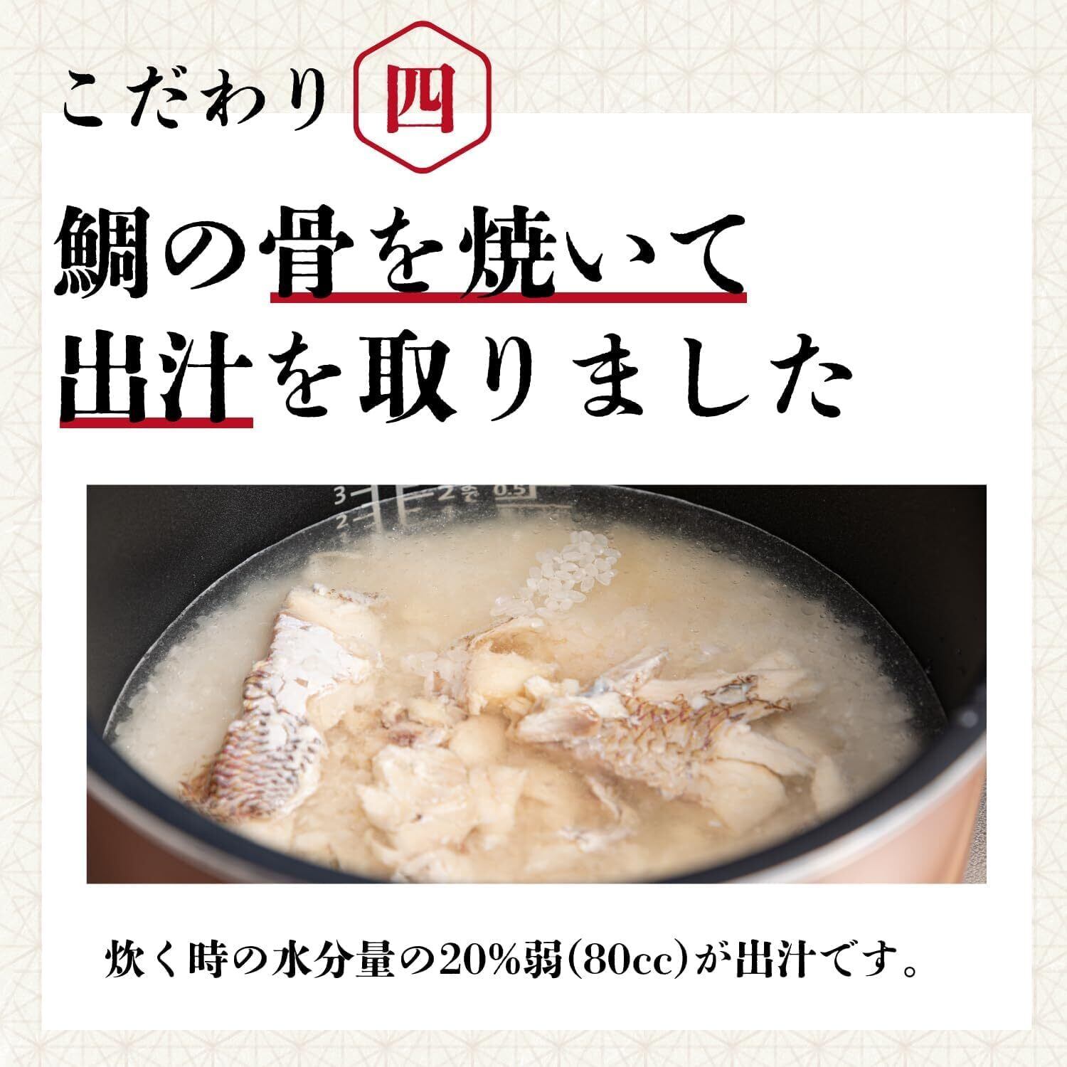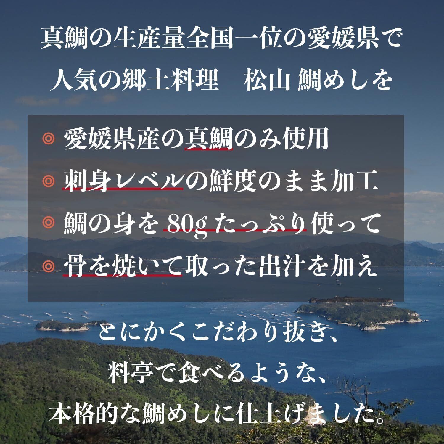 ・愛媛県産真鯛100%使用 ・刺身レベルの鮮度のまま加工 ・鯛の身を80gたっぷり使用 ・骨を焼いて取った出汁を使用。真鯛の切り身と調味だしで炊き込む愛媛の祝い飯です。