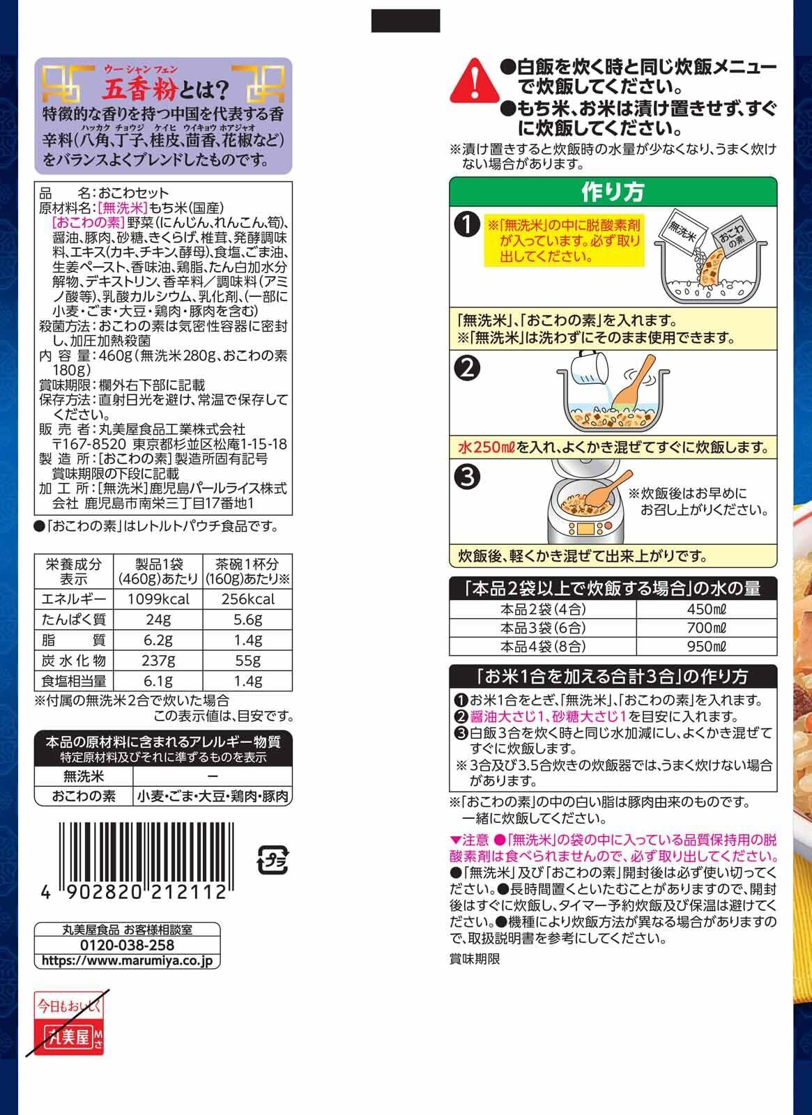 [無洗米]もち米(国産)| [おこわの素]野菜(にんじん、れんこん、筍)、醤油、豚肉、砂糖、きくらげ、椎茸、発酵調味料、エキス(カキ、チキン、酵母)、食塩、ごま油、生姜ペースト、香味油、鶏脂、たん白加水分解物、デキストリン、香辛料/調味料(アミノ酸等)、乳酸カルシウム、乳化剤、(一部に小麦・ごま・大豆・鶏肉・豚肉を含む)