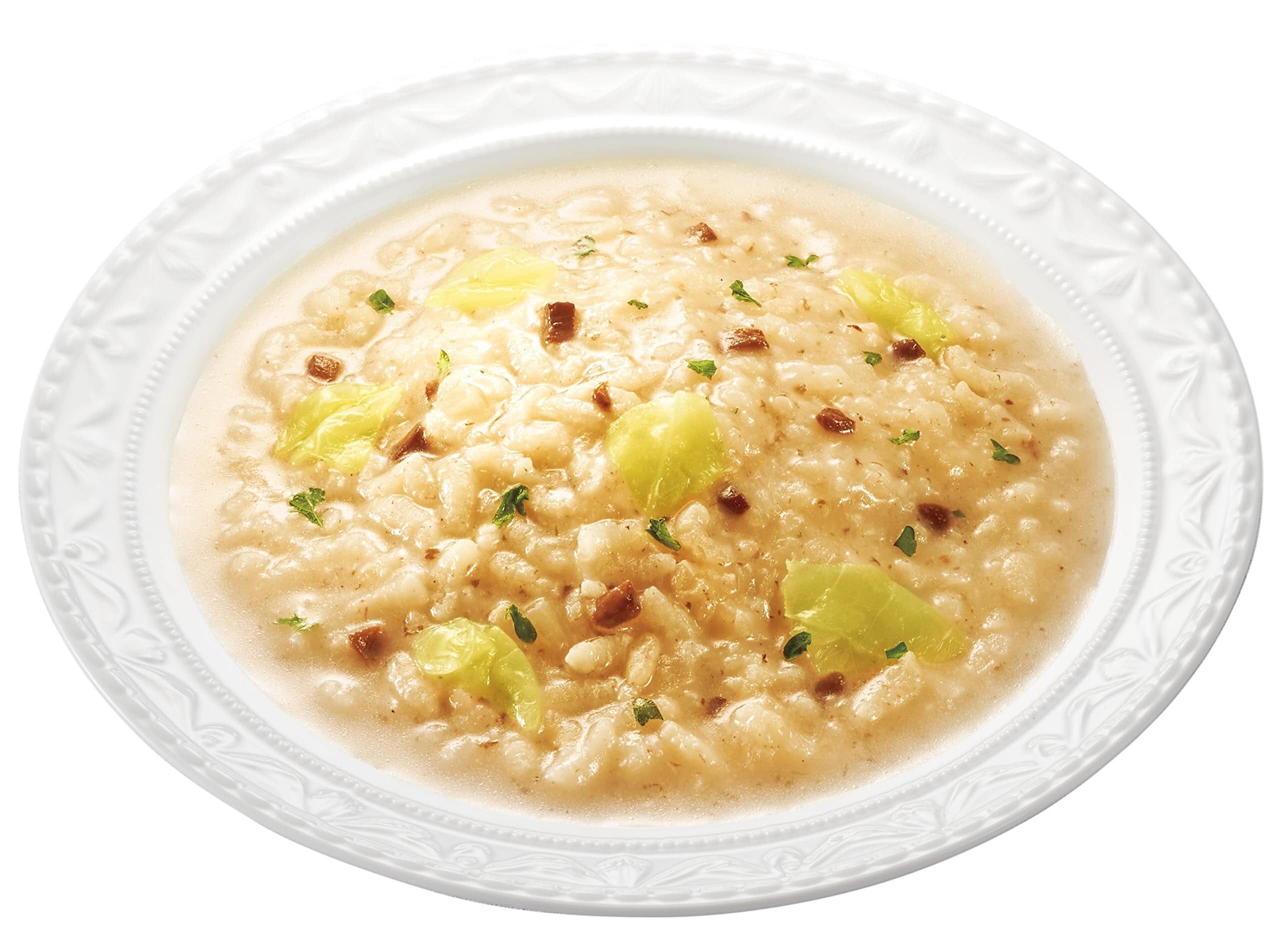 精白米(国産)、オニオンソテー、キャベツ、ソテーマッシュルーム、ゴーダチーズパウダー、パルメザンチーズパウダー、バター、ゴルゴンゾーラチーズパウダー、果実酒、ポークエキス調味料、食塩、ブイヨン風調味料、オニオンエキス、香辛料、酵母エキスパウダー、乾燥パセリ/調味料(アミノ酸等)、酸味料、酸化防止剤(ビタミンE)、香辛料抽出物、(一部に小麦・乳成分・大豆・豚肉を含む)