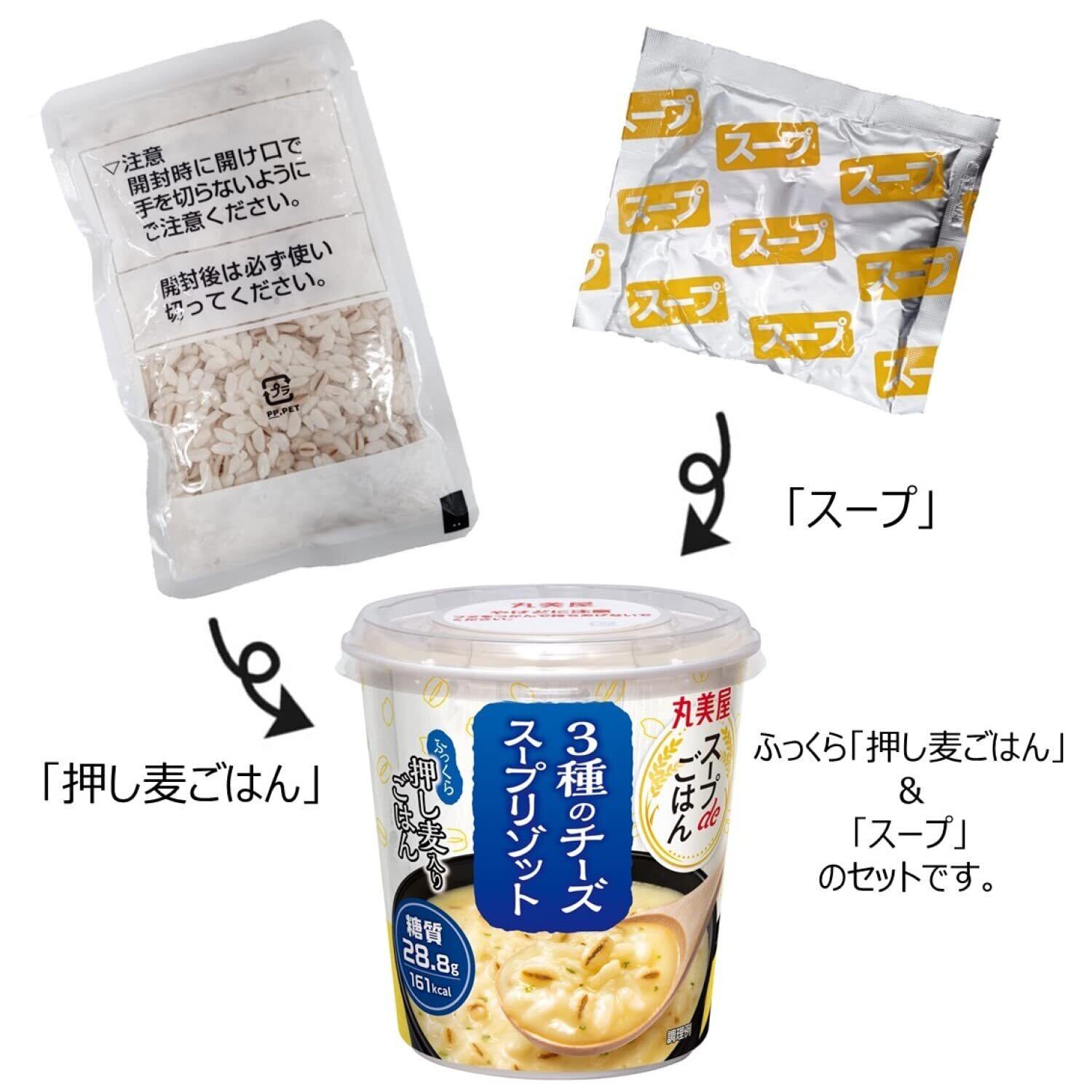 [ごはん]うるち米(国産)、大麦、なたね油/トレハロース、乳化剤、(一部に大豆を含む)|[スープ]チーズパウダー、ポテト粉末、砂糖、乳等を主要原料とする食品、食塩、デキストリン、香辛料、エキス(チキン、オニオン、酵母、ポーク)、たん白加水分解物、醤油、鶏脂、加工油脂、乳糖、水あめ、でん粉/増粘剤(加工でん粉)、調味料(アミノ酸等)、乳化剤、pH調整剤、カゼインNa、香料、加工でん粉、クチナシ色素、(一部に乳成分・小麦・大豆・鶏肉・豚肉を含む)