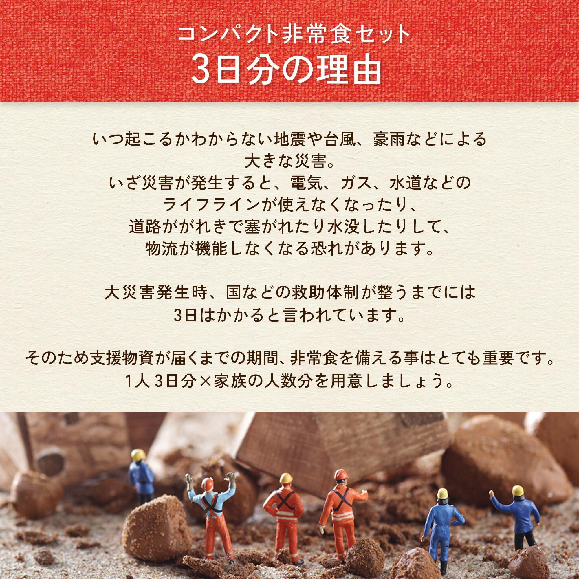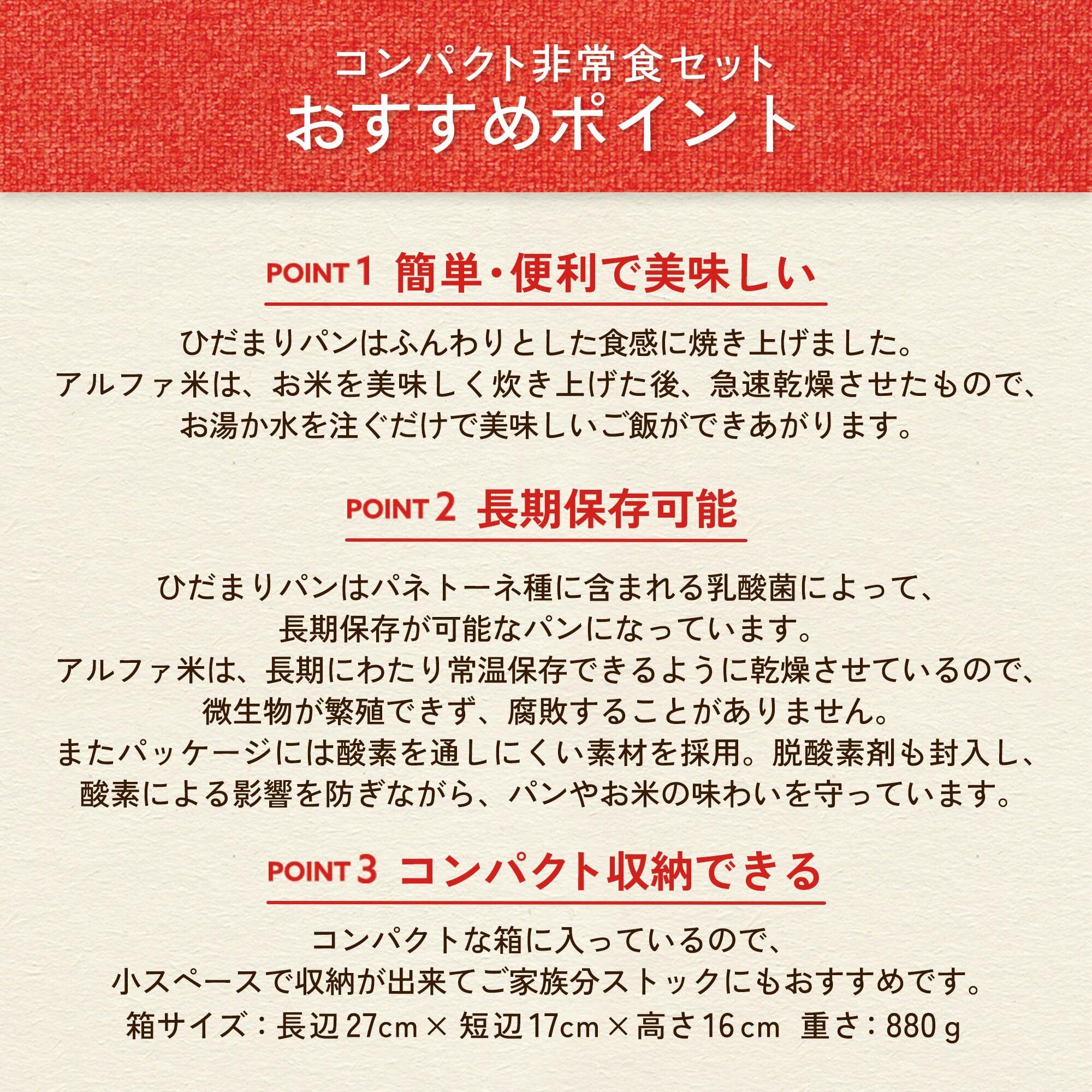 1人3日分を想定しています。すぐに食べられる「ひだまりパン」。持ち運びに優れ、食べる場所を選ばない「携帯おにぎり」。お腹を満たすボリュームたっぷりな「アルファ米」。アルファ米はお湯(待ち時間15分)または水(待ち時間60分)を注いでご飯ができあがります。賞味期限は(製造月から)5年6ヶ月、流通期間6ヶ月として、お客様には保存期間5年以上ある状態でお届けできるようにしております。しかしながら、販売状況によっては5年を下回ることもございますので、ご了承いただけますようお願いいたします。