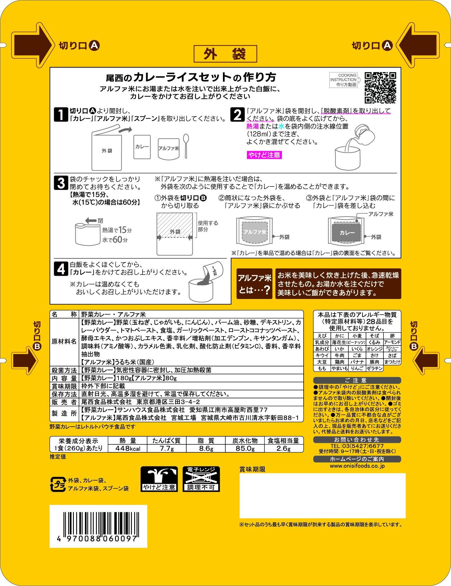 <野菜カレー>野菜(玉ねぎ、じゃがいも、にんじん)、パーム油、砂糖、デキストリン、カレーパウダー、トマトペースト、食塩、ガーリックペースト、ローストココナッツペースト、酵母エキス、かつおぶしエキス、香辛料/増粘剤(加工デンプン、キサンタンガム)、調味料(アミノ酸等)、カラメル色素、乳化剤、酸化防止剤(ビタミンC)、香料、香辛料抽出物 【アルファ米】うるち米(国産)