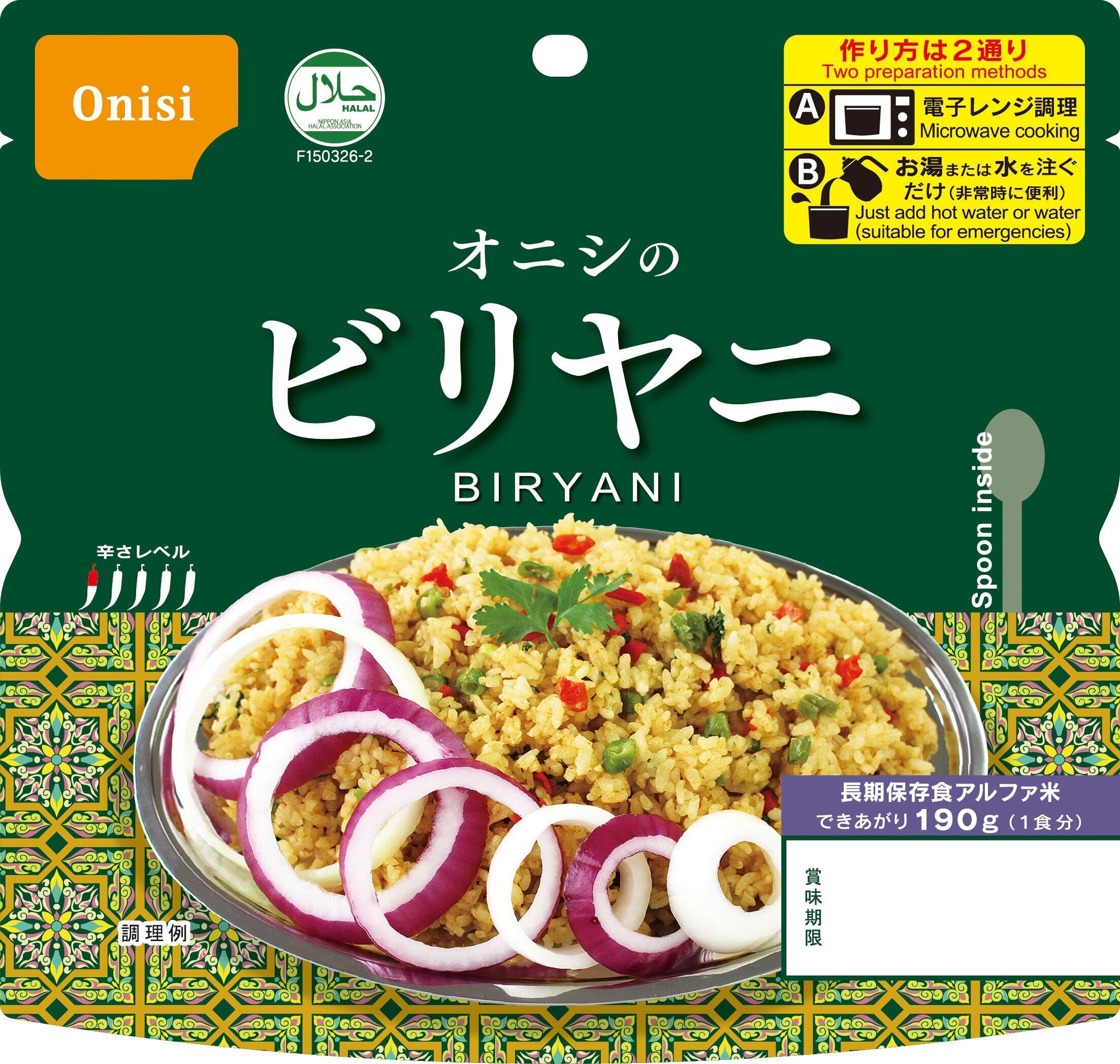 炊きたてのご飯をそのままに急速乾燥させた長期保存食アルファ米、お水を入れるだけで食べることが出来ます。スプーン付きなので食器いらず。ビリヤニとは、インドや中東など幅広い地域で食べられているスパイスを効かせた炊き込みごはんです。お米は国産うるち米のみ使用しております。電子レンジで調理することで、さらにアルファ米を美味しく食べることができるようになりました。災害以外のあらゆる「いざ」という場面でお使いください。