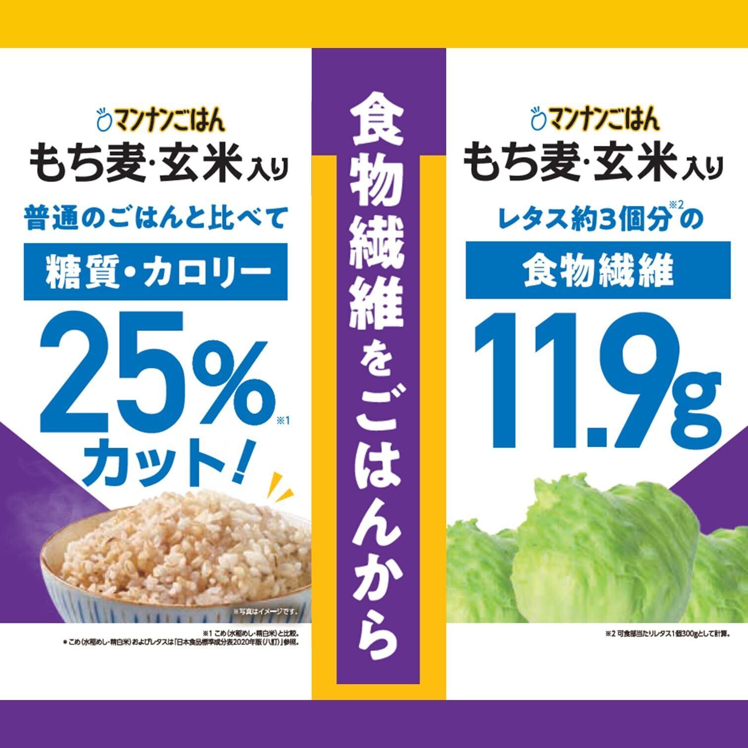 1食で1/2日分の食物繊維 (レタス約3個分)がとれるもち麦と玄米とマンナンヒカリが入ったパックごはん。カロリー・糖質も白米のごはんに比べて糖質・カロリー25%カット。