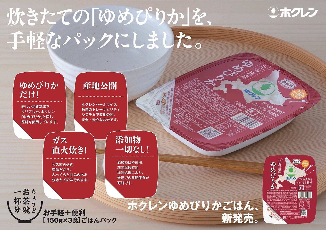 ・精米「ホクレンゆめぴりか」と同じ厳しい基準をクリアした原料を使用しております。1食分にちょうど良い150g入りのパックご飯です。