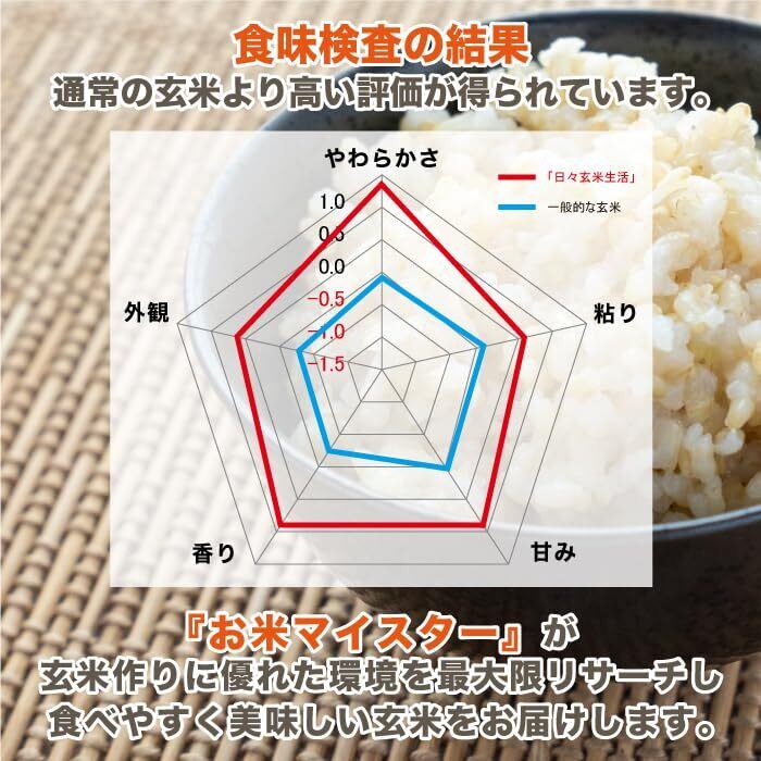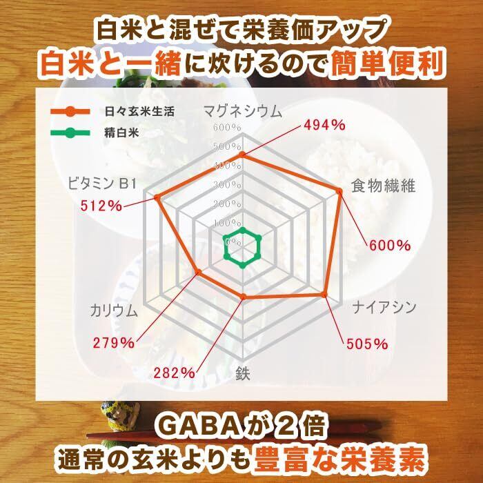 日々玄米生活 玄米 国産 3kg は、白米より栄養価の高い玄米を日々の食卓に並べる事はできないかと考え、手間を最小限に抑え、さらに主食として食べやすく、健康で負担のない玄米生活を送れるように作りました。 ※独自の製法により浸漬時間を短くして、美味しく炊き上げる事ができます。 (おすすめは、30分〜60分と白米を美味しく炊く時と同じ時間を、おすすめします) 原材料は、お米マイスターによる国産のその時期、玄米に最適なお米を選び使用しております。 ※通常の玄米より甘み・やわらかさなどがよくなり、食べやすくなっています。 ※通常玄米に比べGABA(ギャバ)が約2倍に増加しています。 ※「日々玄米生活」には、わずか1合でレタス450gの食物繊維が含まれています。 ◎美味しく食べる玄米の炊き方 お米を軽くすすいでください。 30分〜60分浸漬いただくとより美味しくいただけます。 ※水加減 1合につき、大さじ約4杯(60ml)の水で炊きます。