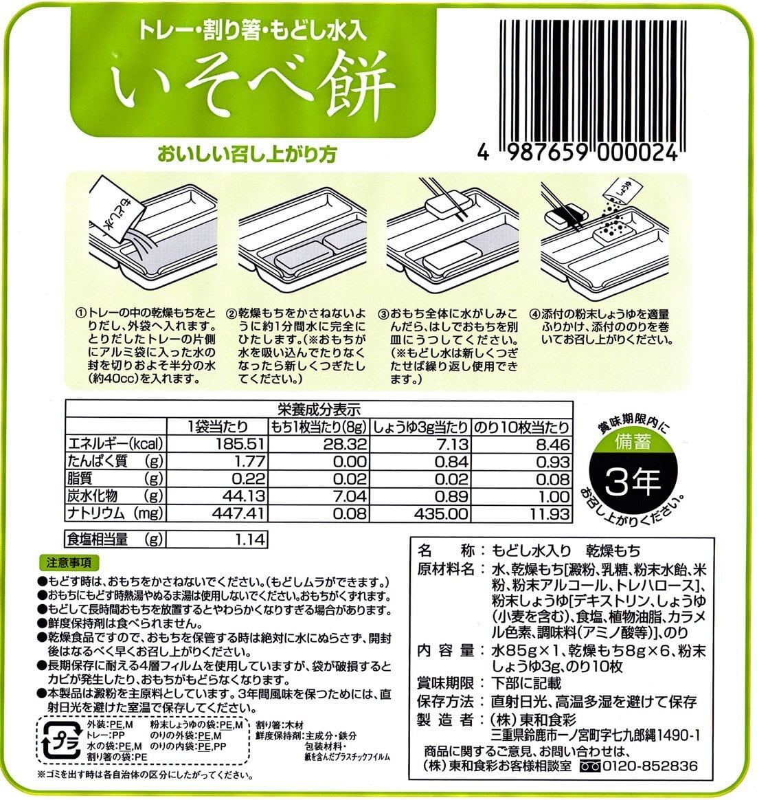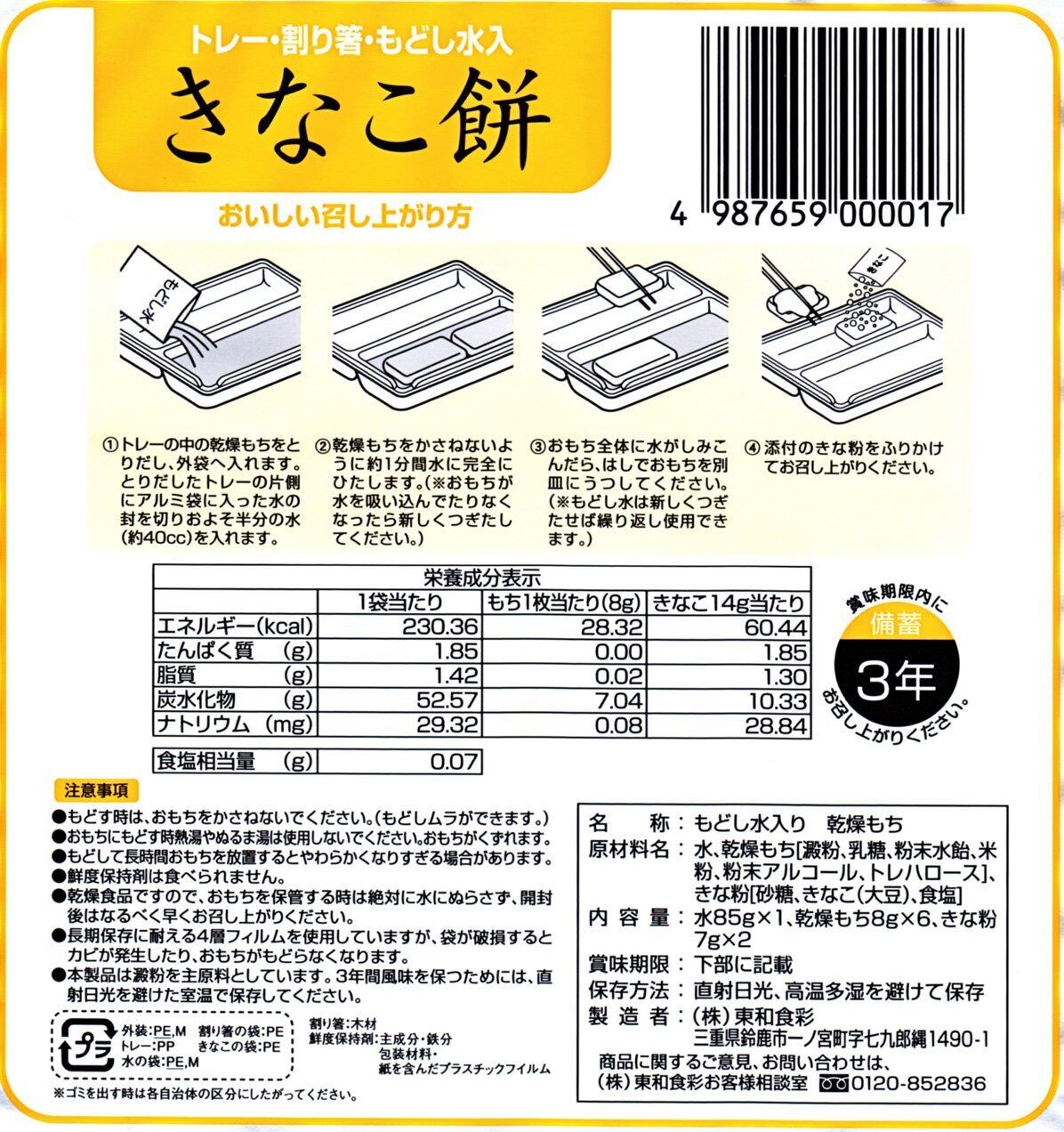 アルミの袋には、専用のプラスチックトレーと割り箸、もどし用の保存水、乾燥もち6枚とそれぞれの袋にきなこ、粉末しょうゆ、のり、黒みつが入っています。封をあければ、どこでもその場で柔らかいつきたてのおもちを召し上がることができます。非常食としても旅行の携帯食、またふだんのおやつにも好適品としておすすめです。