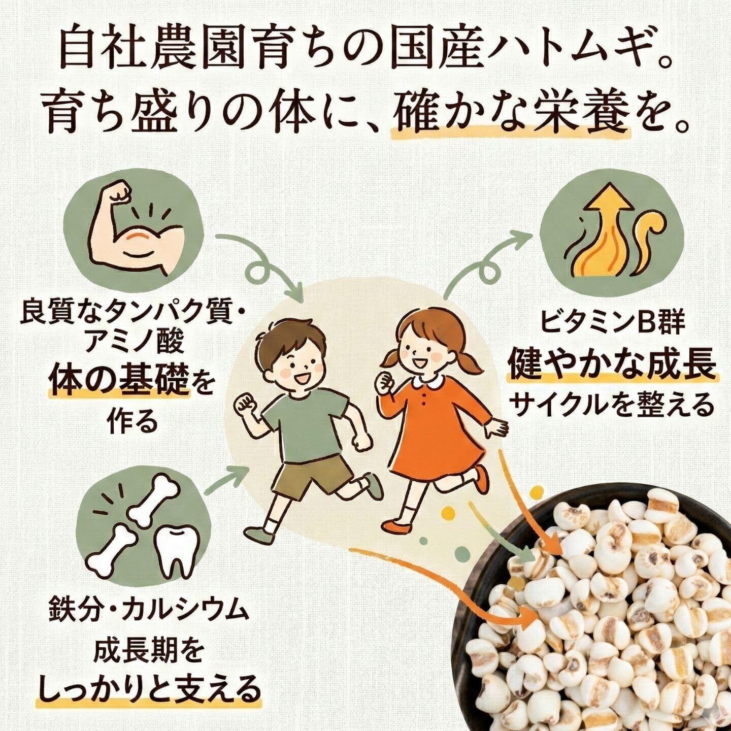 国産ハトムギを香ばしく焙煎し、きめ細かいパウダー状に仕上げました。クセのないやさしい味わいで、ヨーグルトやスムージー、おかゆやスープ、パンや焼き菓子のトッピングなど、さまざまな料理にお使いいただけます。 hatomugi(はと麦)は、美容や健康を気にされる方にも注目されている自然素材。 たんぱく質・ビタミンB群・食物繊維などを含み、毎日の食生活を内側からサポートします。 100g入りで使い切りやすく、保存に便利なチャック付きパッケージ。手軽に取り入れられる健康習慣として、毎日の“すこやかごはん”にぴったりです。 ハトムギパウダーは、毎日の食卓に手軽に取り入れられる万能素材です。ヨーグルトやスムージーに混ぜれば、朝食や間食がぐっと香ばしくヘルシーに。 おかゆやスープの仕上げに加えることで、味に深みが出て、自然な風味が広がります。また、バタートーストにふりかけたり、パンケーキやお団子の生地に練り込んだりと、おやつ作りにもぴったり。粉末タイプなので使いやすく、美容や健康を意識した食生活のサポートにもおすすめです。