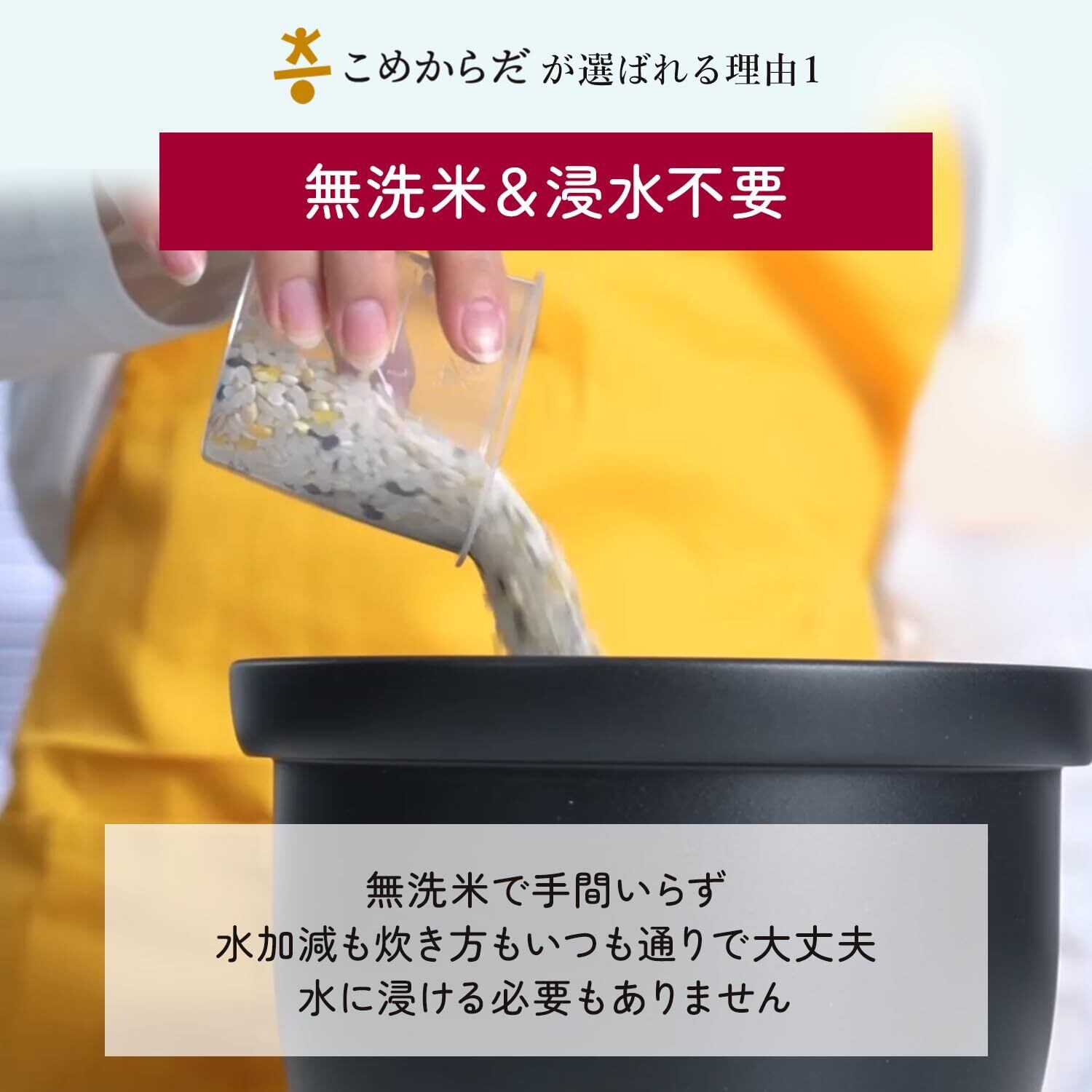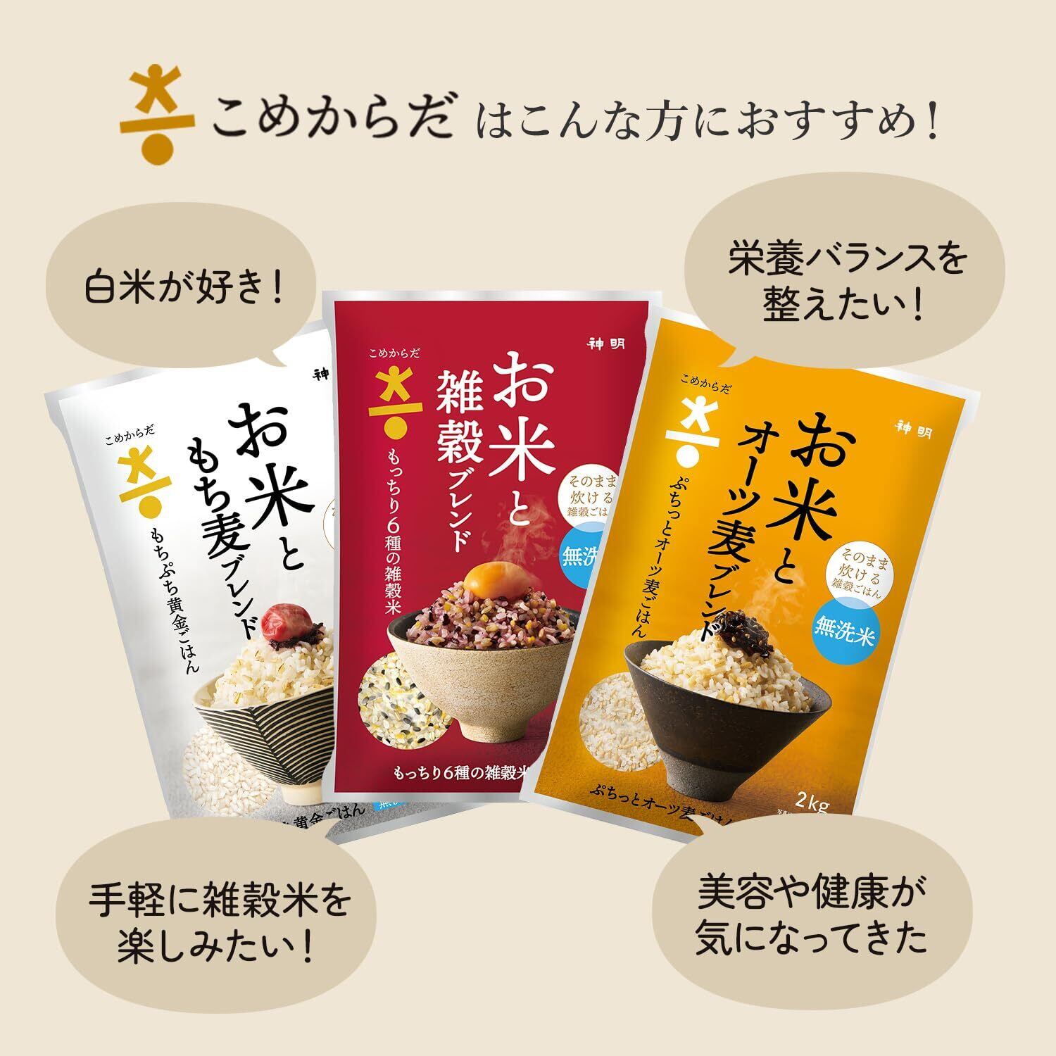 ・【ありそうでなかった新商品】あらかじめ雑穀がブレンドされた水研ぎ不要の無洗米。白ごはん好きの方のための「こめからだ」です。 ・【雑穀入門編にぴったり】玄米や雑穀に興味があるけれど、「上手く炊けなかった」「混ぜる分量が分からない」「水加減が分からない」「そもそも炊き方が分からない」そんな方へおすすめ。 ・【冷めても続くもちもち感】うるち米は「つやモチ感」が味わえる様に、明治35年創業の米屋の神明が選び抜いたお米をブレンドしています。もち麦の”もちもち感”と玄米の自然な甘みも味わえます。黄金もち麦の「黄金」には、光や紫外線から目を守る働きを持つ天然色素「ルテイン」が含まれています。圧力&スチームの独自製法で仕上げているもち麦なので、”もちもちぷちぷち”です。食物繊維白米比約3倍。 ・【原料配合】うるち米(国内産)、加工玄米(玄米(国内産))、もち麦 原材料・成分 うるち米(国内産)、加工玄米(玄米(国内産))、もち麦 ※お米や雑穀の産地・年産・品種によって、ご飯の食味や見た目が異なる場合がありますが、品質には問題ございません。