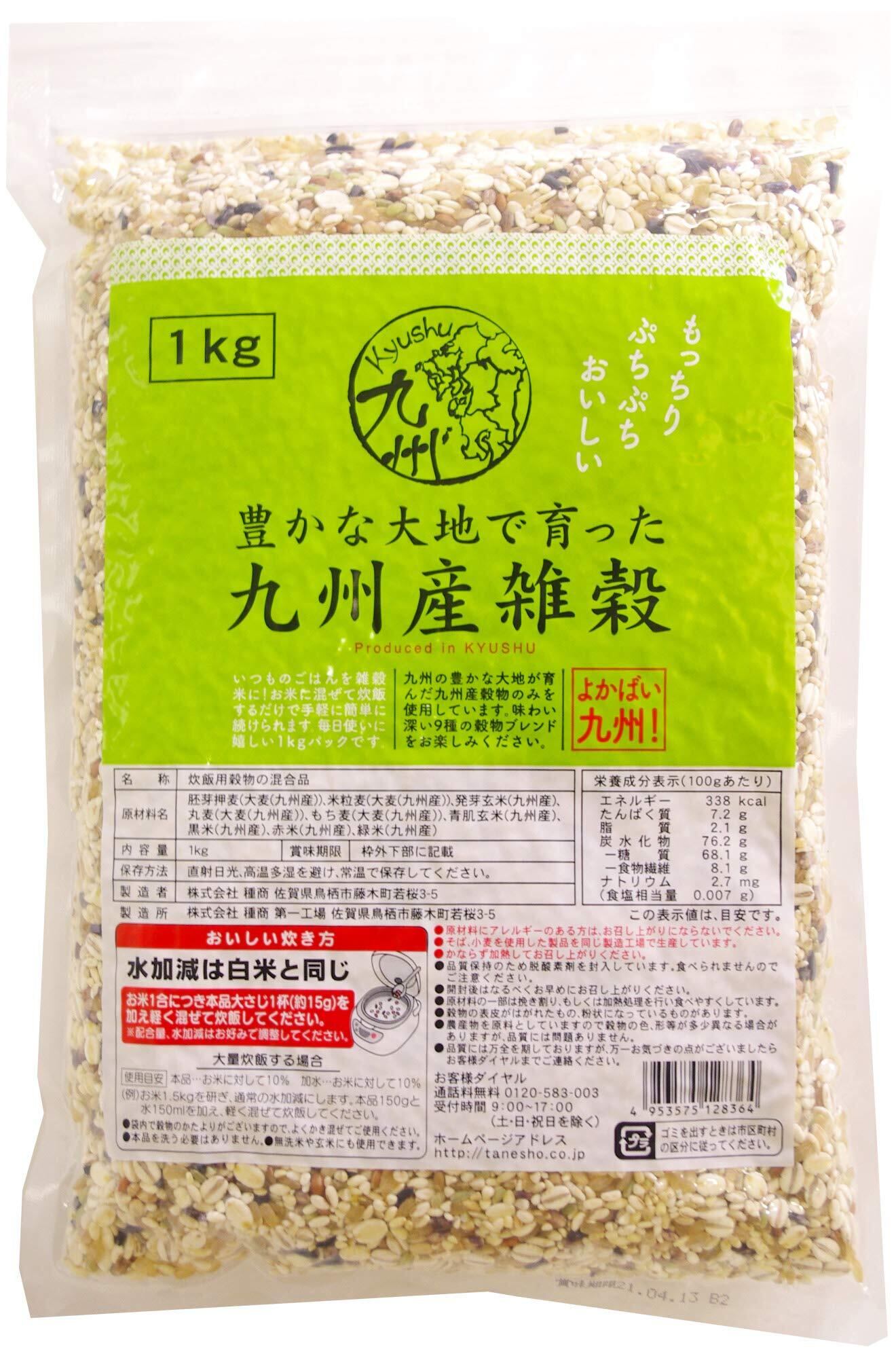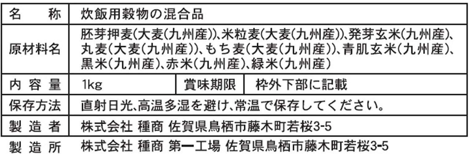 胚芽押麦(大麦(九州産))、米粒麦(大麦(九州産))、発芽玄米(九州産)、丸麦(大麦(九州産))、もち麦(大麦(九州産))、青肌玄米(九州産)、黒米(九州産)、赤米(九州産)、緑米(九州産)