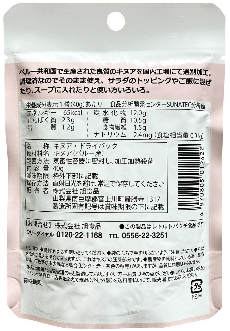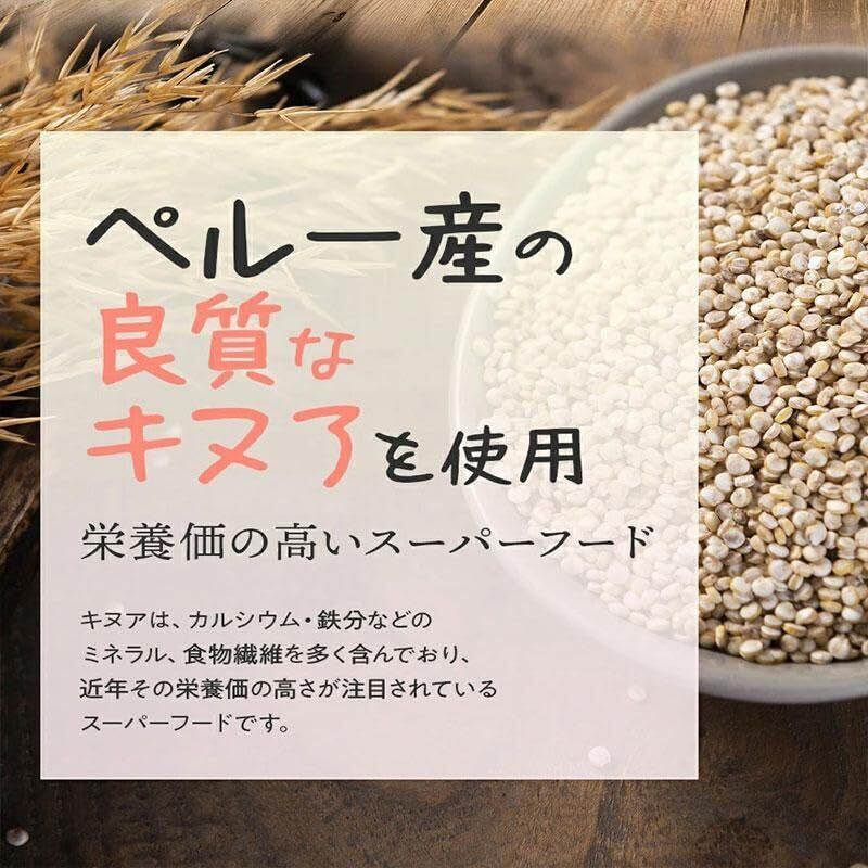 大好評の「そのまま食べるキヌア」が、装いも新たに登場しました。 キヌアは、世界各地で利用されている穀物のひとつです。 ペルー産のキヌアを使用し、国内工場にて選別・加工を行い、使いやすい40gのドライパックにしました。 キヌア料理を作りたいものの、「下処理や調理に手間や時間がかかる」という声をもとに開発しました。 本商品は加熱済みのため、下ごしらえの必要がなく、袋から出してそのままさまざまな料理にお使いいただけます。 炊いたご飯に混ぜたり、サラダやスープに加えたりと、用途に合わせて幅広くご利用いただけます。 本品は、カルシウムや鉄分などのミネラル、食物繊維を含んでいます。 ※開封後はお早めにお召し上がりください。