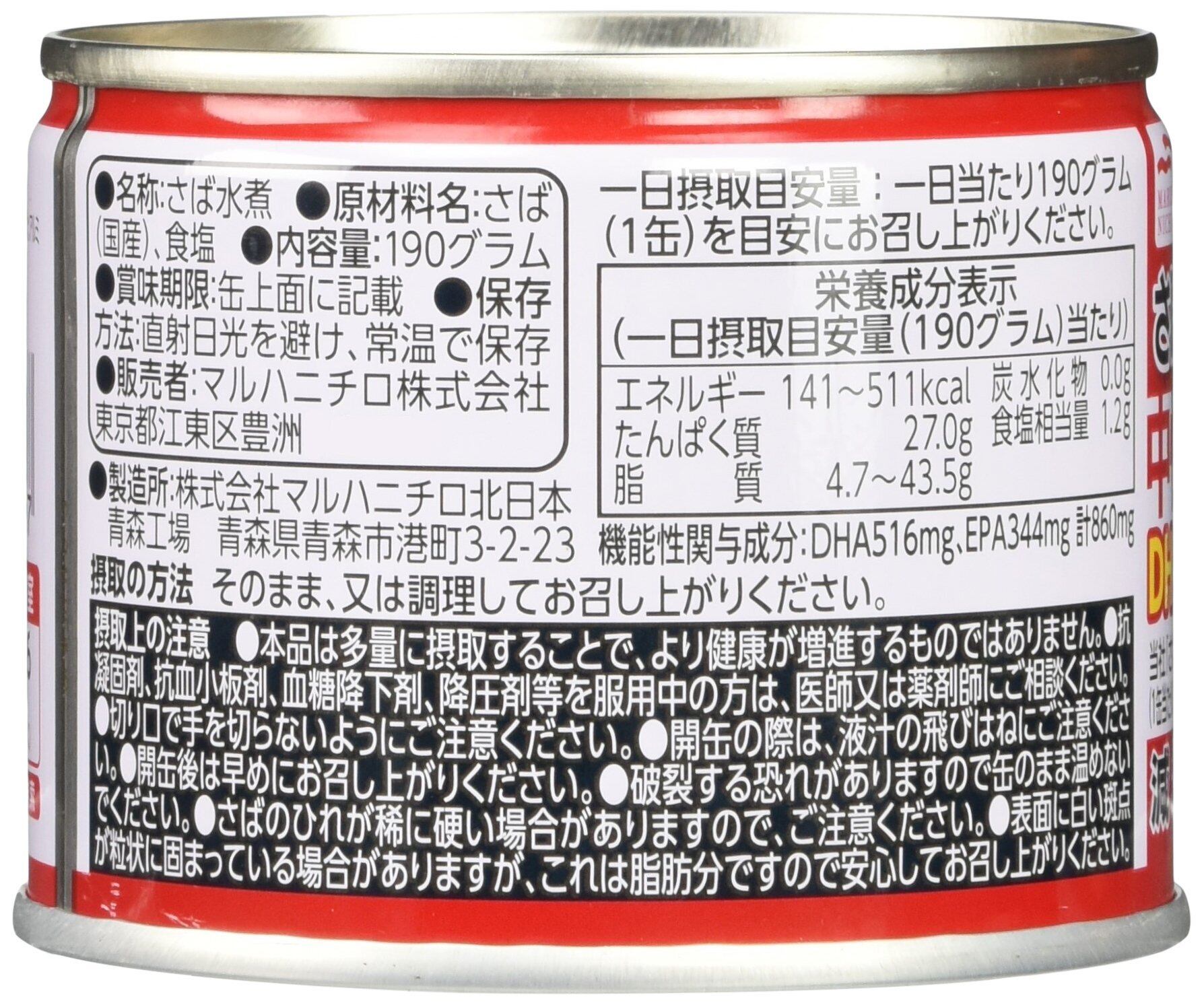消費者庁届出受理商品です。中性脂肪を低下させる機能がある魚由来のDHA(ドコサヘキサエンサン)とEPA(エイコサペンタエンサン)を含んでいます。また、既存の当社さば水煮缶詰と比較して、25%減塩しております。マルハニチロは世界においしいしあわせをお届けします。