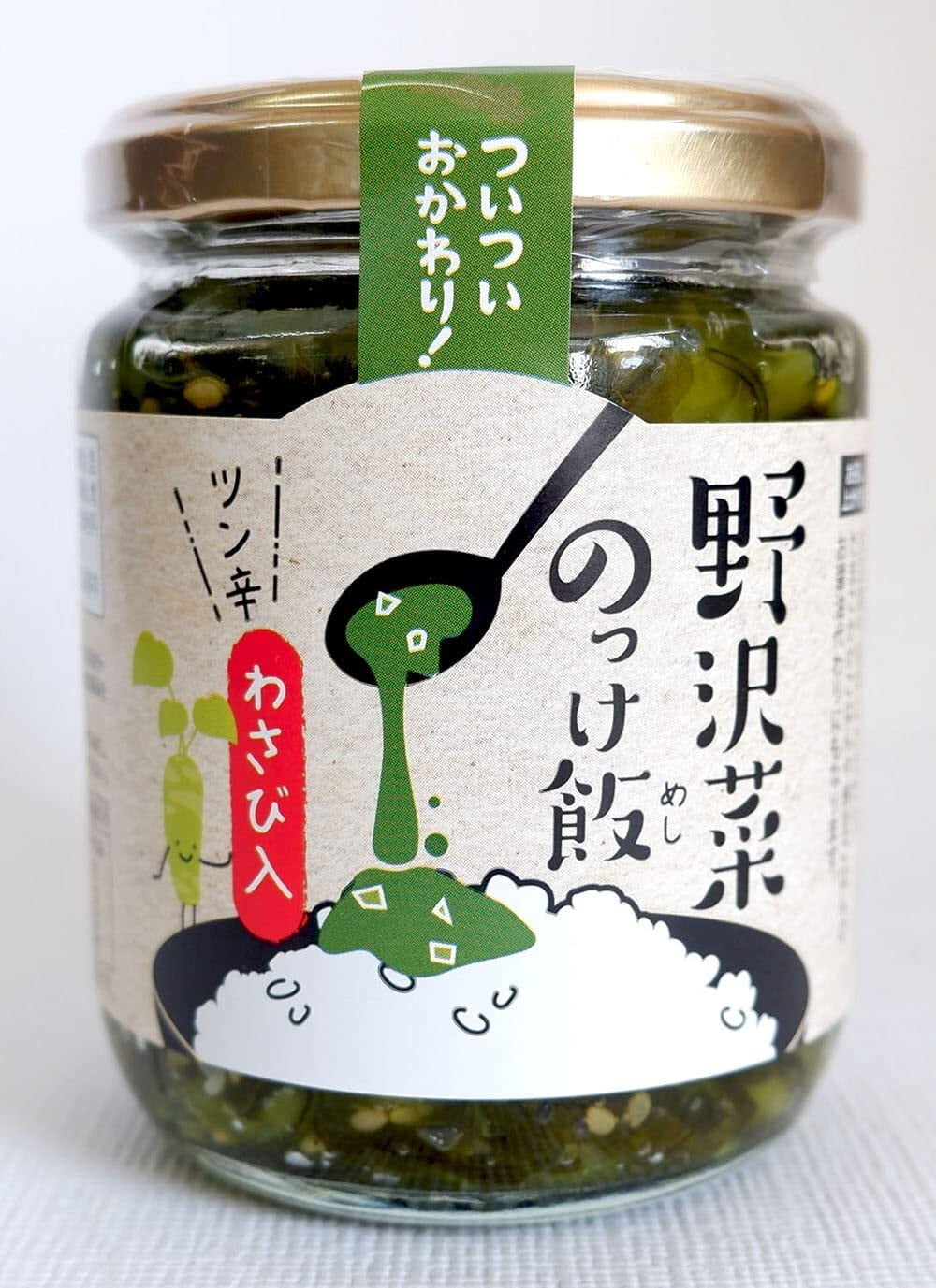 野沢菜、わさび、漬け原材料(たん白加水分解物、昆布、食塩、砂糖、ごま、醤油、唐辛子、鰹節粉末)/ソルビット、調味料(アミノ酸等)、酒精、増粘多糖類、環状オリゴ糖、香料、酸味料、甘味料(ステビア、甘草)、香辛料抽出物、着色料(黄4、青1)、(一部に小麦・大豆・ごまを含む)