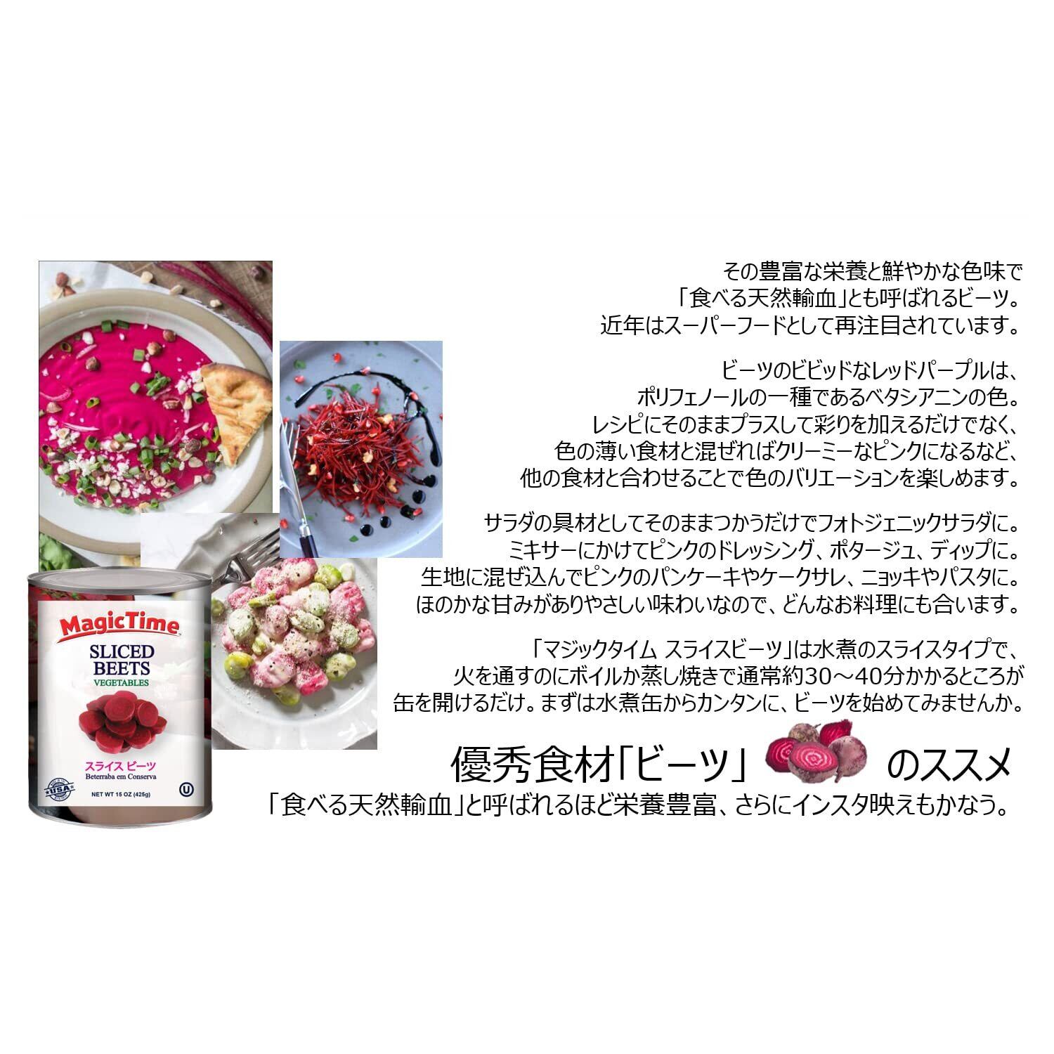 ビーツは、その豊富な栄養と鮮やかな色味で「食べる天然輸血」 とも呼ばれ、近年はスーパーフードとして再注目されています。 ビーツのビビッドなレッドパープルは、 ポリフェノールの一種であるベタシアニンの色。 レシピにそのままプラスして彩りを加えるだけでなく、 色の薄い食材と混ぜればクリーミーなピンクになるなど、 他の食材と合わせることで色のバリエーションを楽しめます。 サラダの具材としてそのままつかうだけでカラフルサラダに。 ミキサーにかけてピンクのドレッシングやソース、ポタージュ、ディップに。 生地に混ぜ込んでピンクのパンケーキやケークサレ、ニョッキやパスタに。 ほのかな甘みがありやさしい味わいなので、どんなお料理にも合います。 「マジックタイム スライスビーツ」は水煮のスライスタイプで、火を通すのに ボイルか蒸し焼きで通常約30~40分かかるところが、缶を開けるだけ。 まずは水煮缶からカンタンに、ビーツを始めてみませんか。