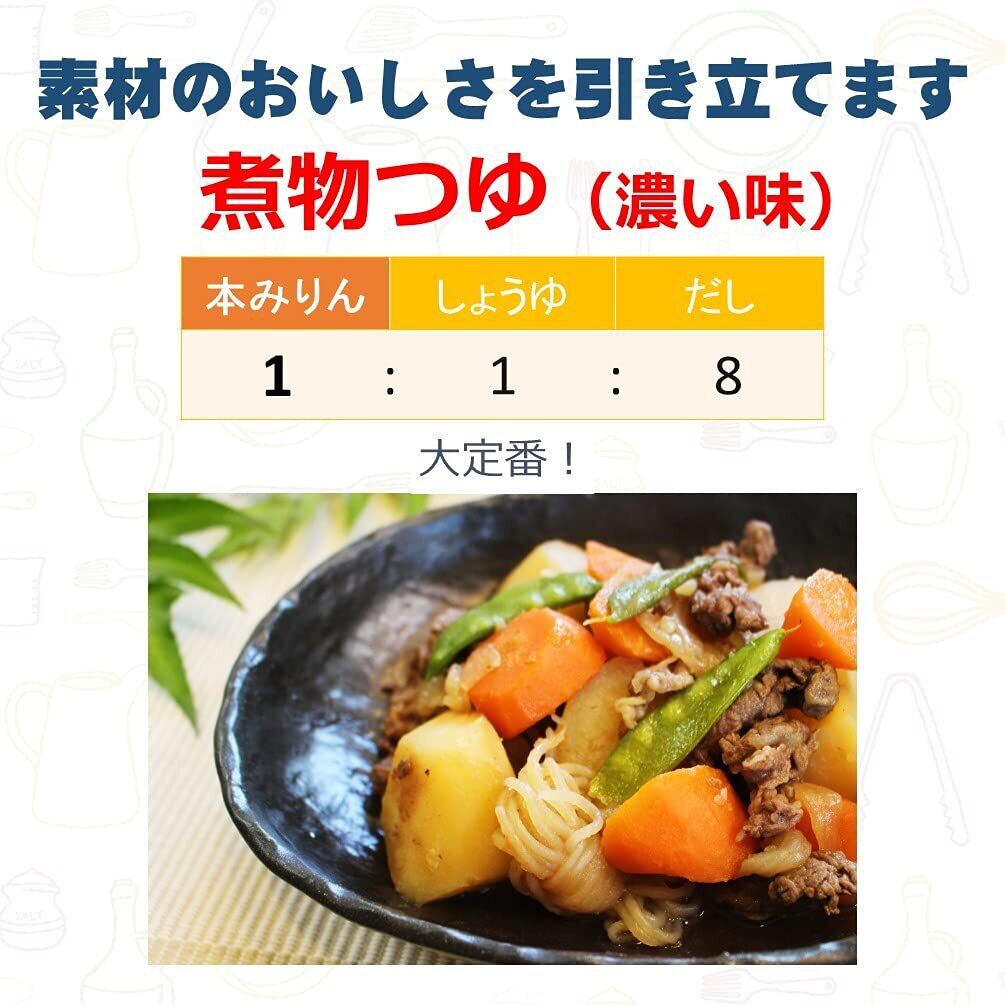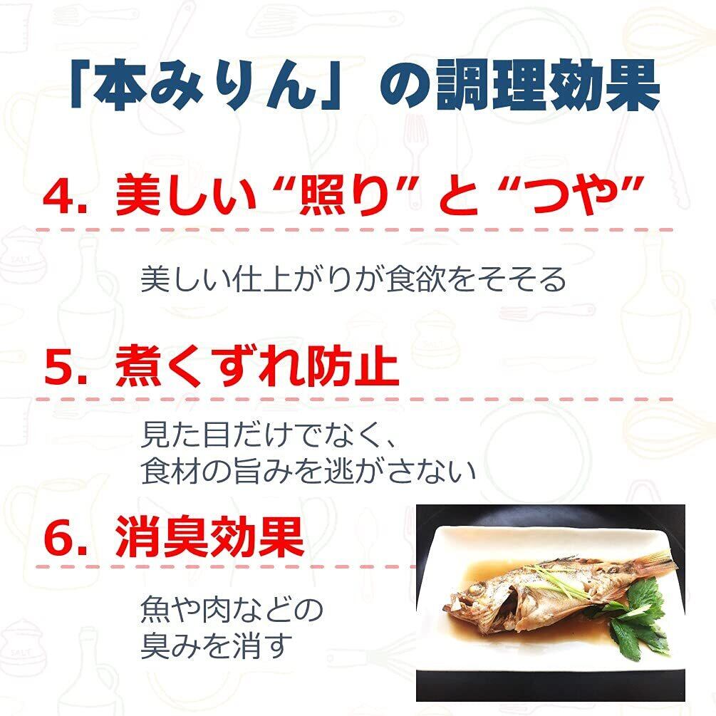 清酒の蔵元が丹念に仕込んだ「本みりん」。料理がさらに 美味しく仕上がります。【「本みりん」の様々な調理効果】1.上品でまろやかな甘み:本みりんの甘みは砂糖に比べて、ブドウ糖やオリゴ糖など多種類の糖で 構成されているため、やわらかで上品に仕上がります。2.「照り」と「つや」:本みりんは照りとつやに有効な糖類など複数の糖類を含み、食材の表面に照り とつやをつけます。3.深いコクと旨み:本みりんに含まれる、アミノ酸などの旨み成分と糖類、その他の成分が複雑にからみあって、深いコクと旨みが生まれ ます。4.煮くずれ防止:本みりんの砂糖とアルコールが素材の煮くずれを防ぎます。5.味がしみ込む:アルコールが素早く食材にしみ込み、旨み成分のアミ ノ酸や有機酸・糖類などの味もしみ込みやすくなります。6.マスキング効果:本みりんには生臭みを消す働きがあります。
