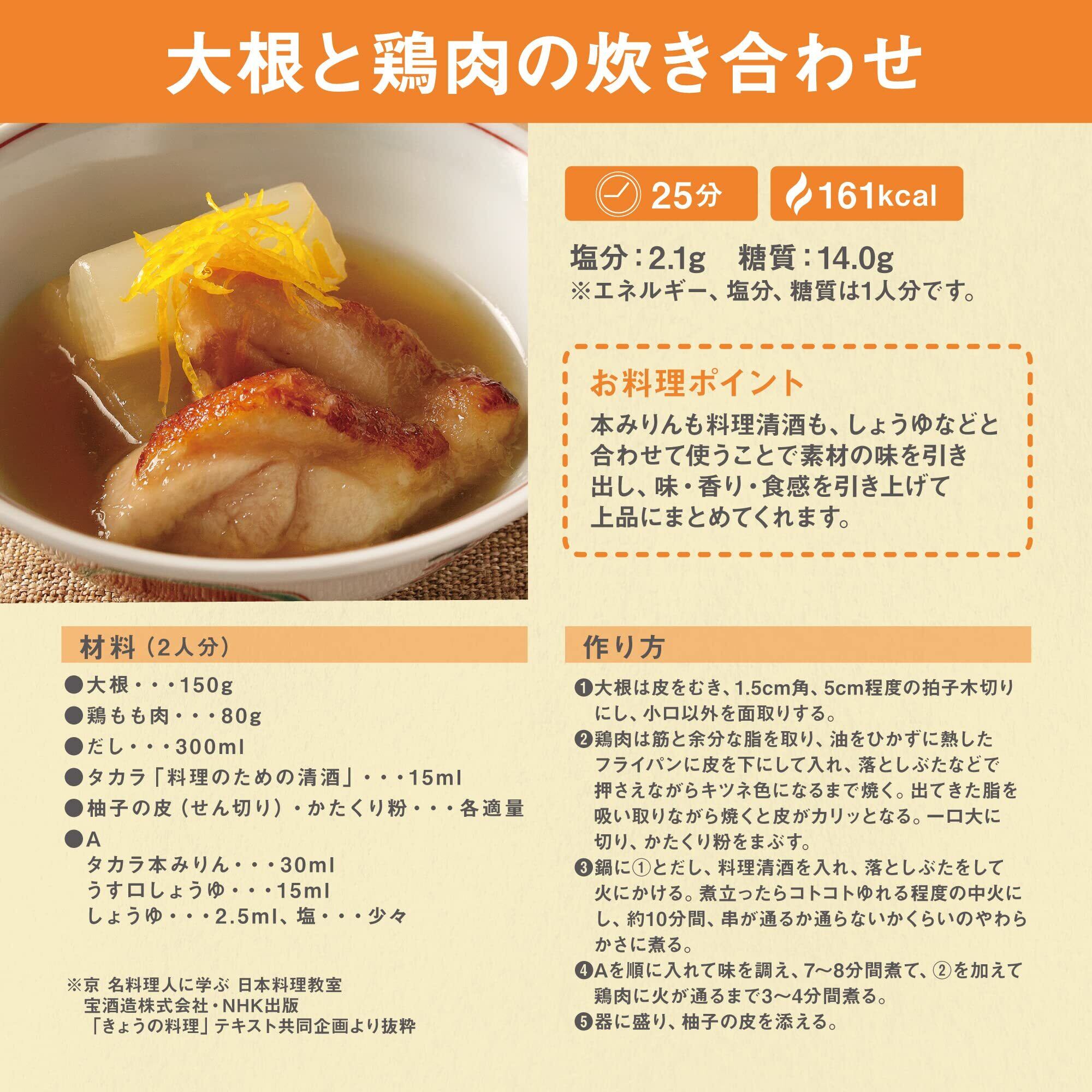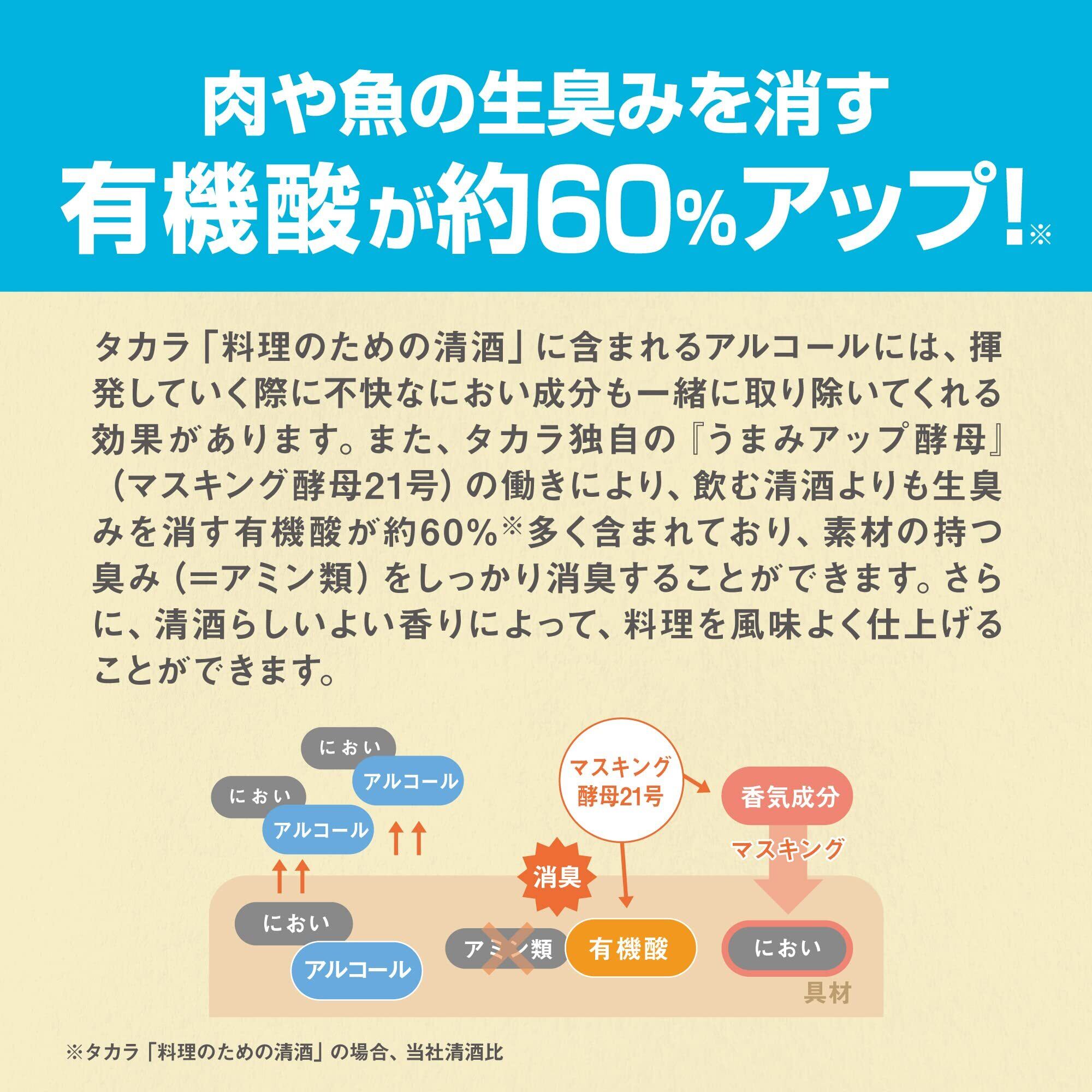 料理をおいしくすることにこだわった「食塩ゼロ」「国産米100%使用」の清酒。米と米こうじ及び水で仕込んだ純米造りに加え、タカラ独自の『うまみアップ酵母』の働きにより、飲む清酒よりも生臭みを消す有機酸・うまみ成分(コハク酸)を豊富に含んでいます。そのため、肉や魚の生臭みをしっかりと消臭する効果や、料理にコクとうまみを与える効果に優れており、料理を風味よく仕上げます。