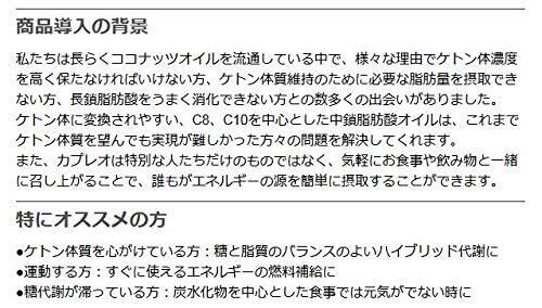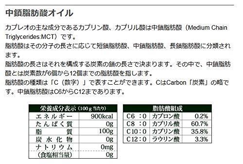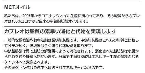 270g 1、ココナッツオイルは非常に酸化しにくい脂肪酸で構成されています。酸化による劣化が少ないので酸化防止には最適の健康オイルです。 2、ココナッツオイルの「カプレオ」は中鎖脂肪酸のC8カプリル酸とC10カプリン酸に特化。その他のオイルとは全く違う代謝経路をたどりエネルギー消費と補充に注力しました。