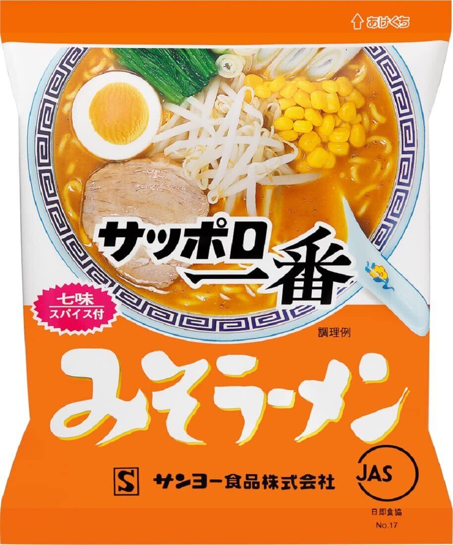 ロングセラー「サッポロ一番」シリーズの「サッポロ一番 みそラーメン」。手の取りやすい個食10食入りとなります(パックだと2パック分)。みそを練り込むことでスープとの一体感に優れためんは、もちっとしたしなやかな食感をお楽しみいただけます。さらに別添の「七味スパイス」がスープの味わいを引き締めます。どんな具材とも相性が良い味づくりで長年愛され続けている、インスタントラーメンを代表するロングセラー商品です。 原材料・成分 油揚げめん(小麦粉(国内製造)、食用油脂(ラード、植物油脂)、でん粉、食塩、しょうゆ、みそ)、スープ(みそ、食塩、香辛料、砂糖、ポークエキス、ねぎ、かつおエキス、酵母エキス、発酵調味料)、やくみ(七味唐辛子)/調味料(アミノ酸等)、炭酸カルシウム、かんすい、カラメル色素、増粘多糖類、香辛料抽出物、クチナシ色素、酸化防止剤(ビタミンE)、酸味料、ビタミンB2、ビタミンB1、(一部に小麦・乳成分・ごま・大豆・鶏肉・豚肉を含む)