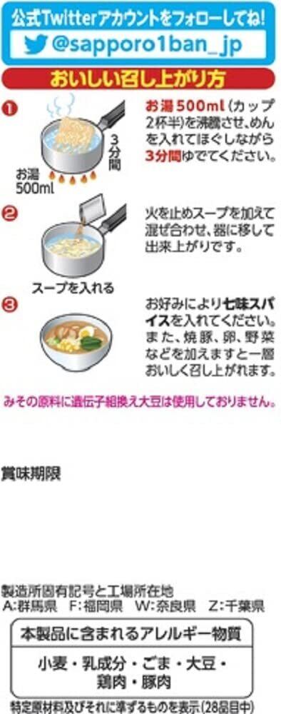 油揚げめん(小麦粉(国内製造)、食用油脂(ラード、植物油脂)、でん粉、食塩、しょうゆ、みそ)、スープ(みそ、食塩、香辛料、砂糖、ポークエキス、ねぎ、かつおエキス、酵母エキス、発酵調味料)、やくみ(七味唐辛子)/調味料(アミノ酸等)、炭酸カルシウム、かんすい、カラメル色素、増粘多糖類、香辛料抽出物、クチナシ色素、酸化防止剤(ビタミンE)、酸味料、ビタミンB2、ビタミンB1、(一部に小麦・乳成分・ごま・大豆・鶏肉・豚肉を含む)