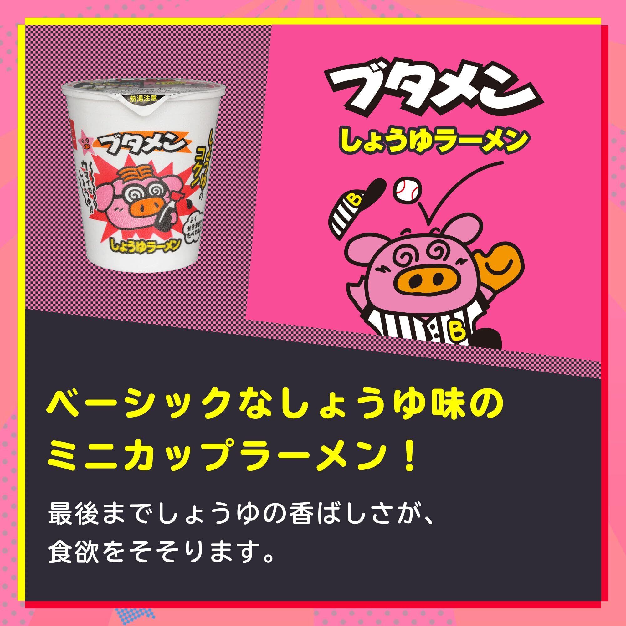 定番のミニカップラーメン、ブタメンしょうゆ味。ブタメンは1993年に初めて発売されました。さっぱりと食べやすい味わい深い醤油スープが食欲をそそります。少し小腹がすいたときに、おやつや夜食に、ランチのおともに、ぴったりなミニサイズ。お子様からおとなの方まで幅広く召し上がっていただけます。