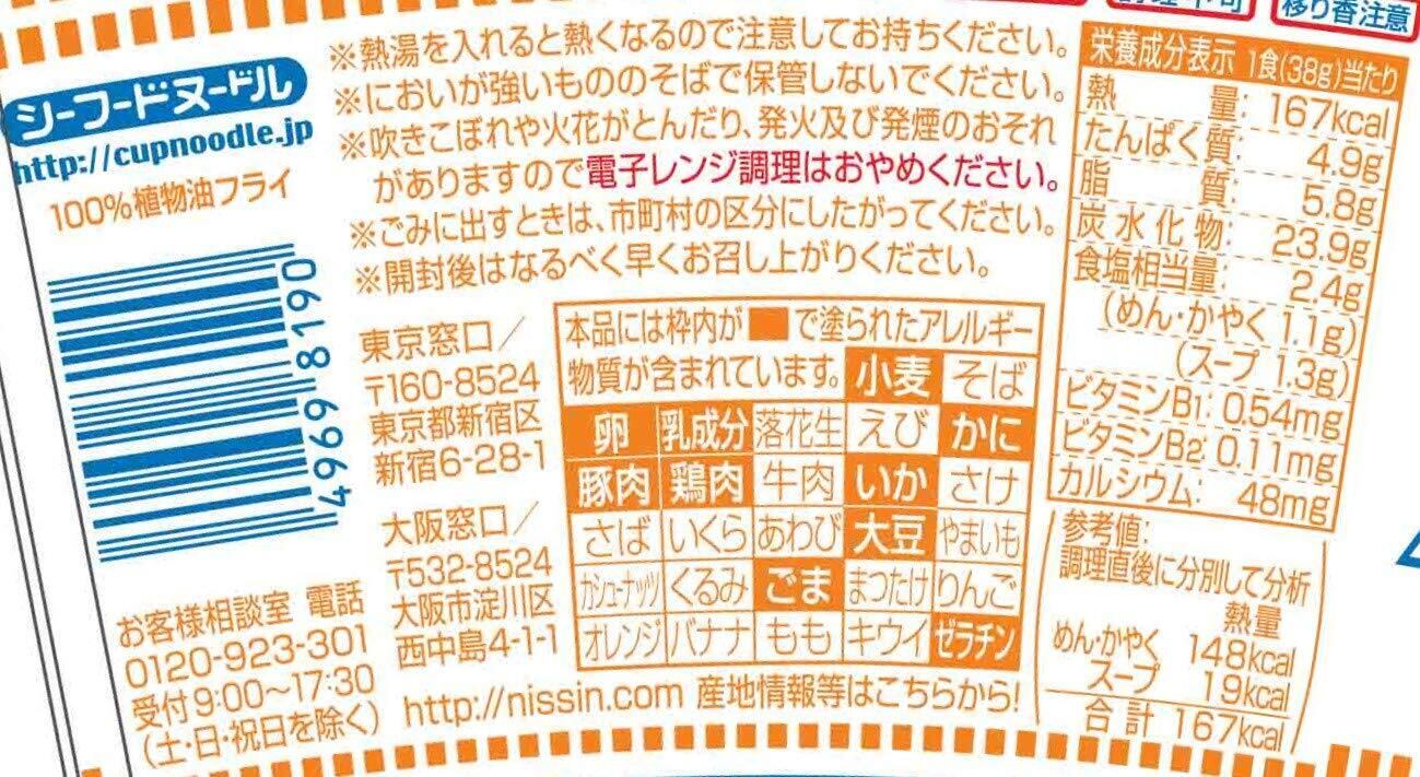 油揚げめん(小麦粉、植物油脂、食塩、たん白加水分解物、醤油)、いか、キャベツ、ポークエキス、チキンエキス、味付卵、魚肉練り製品、糖類、香辛料、醤油、乳等を主要原料とする食品、野菜調味油、ねぎ、野菜エキス、たん白加水分解物、魚介エキス、加工でん粉、調味料(アミノ酸等)、炭酸Ca、かんすい、増粘多糖類、酸味料、カラメル色素、紅麹色素、乳化剤、香料、酸化防止剤(ビタミンE)、カロチノイド色素、香辛料抽出物、ビタミンB2、ビタミンB1、(原材料の一部に落花生、かに、ゼラチンを含む)