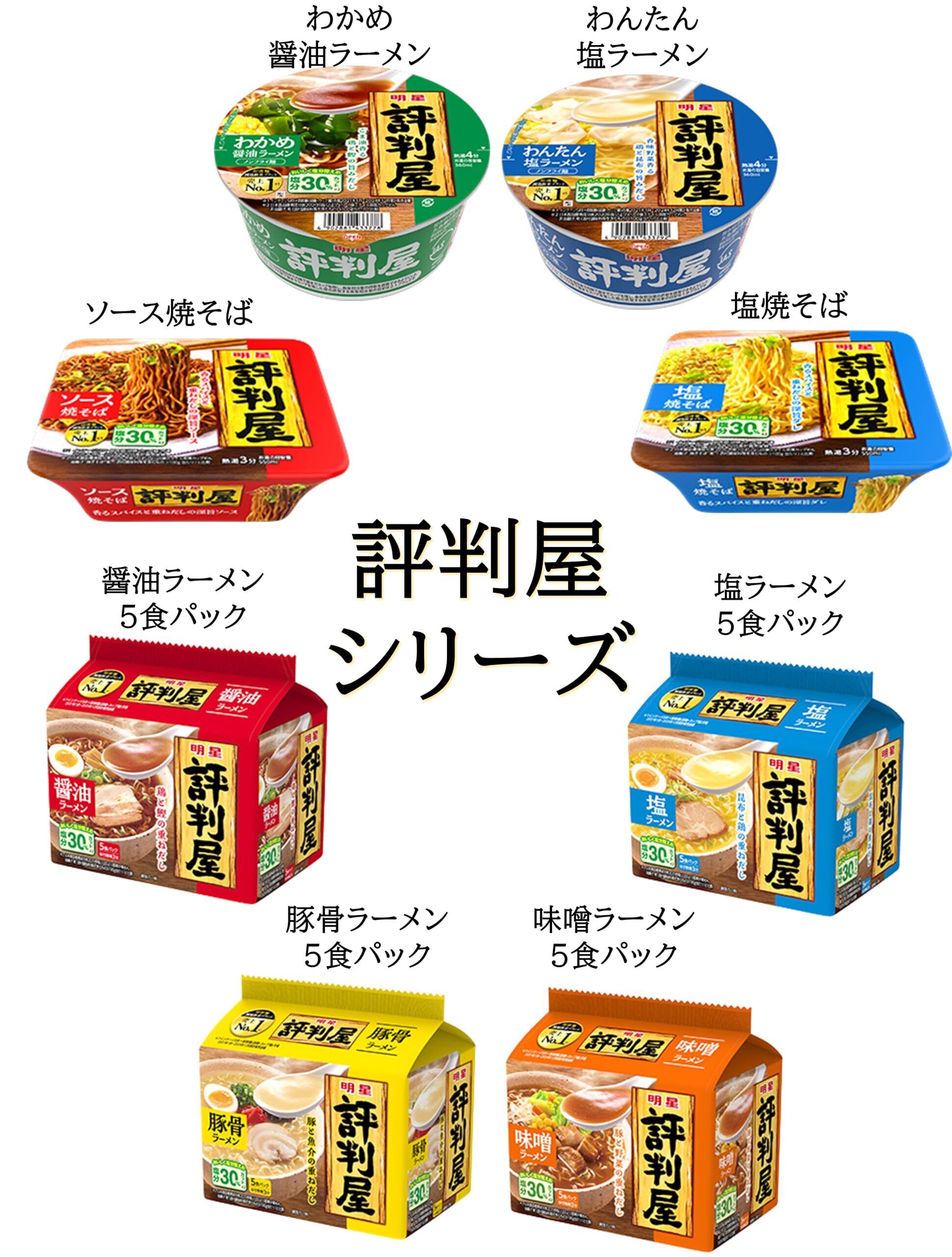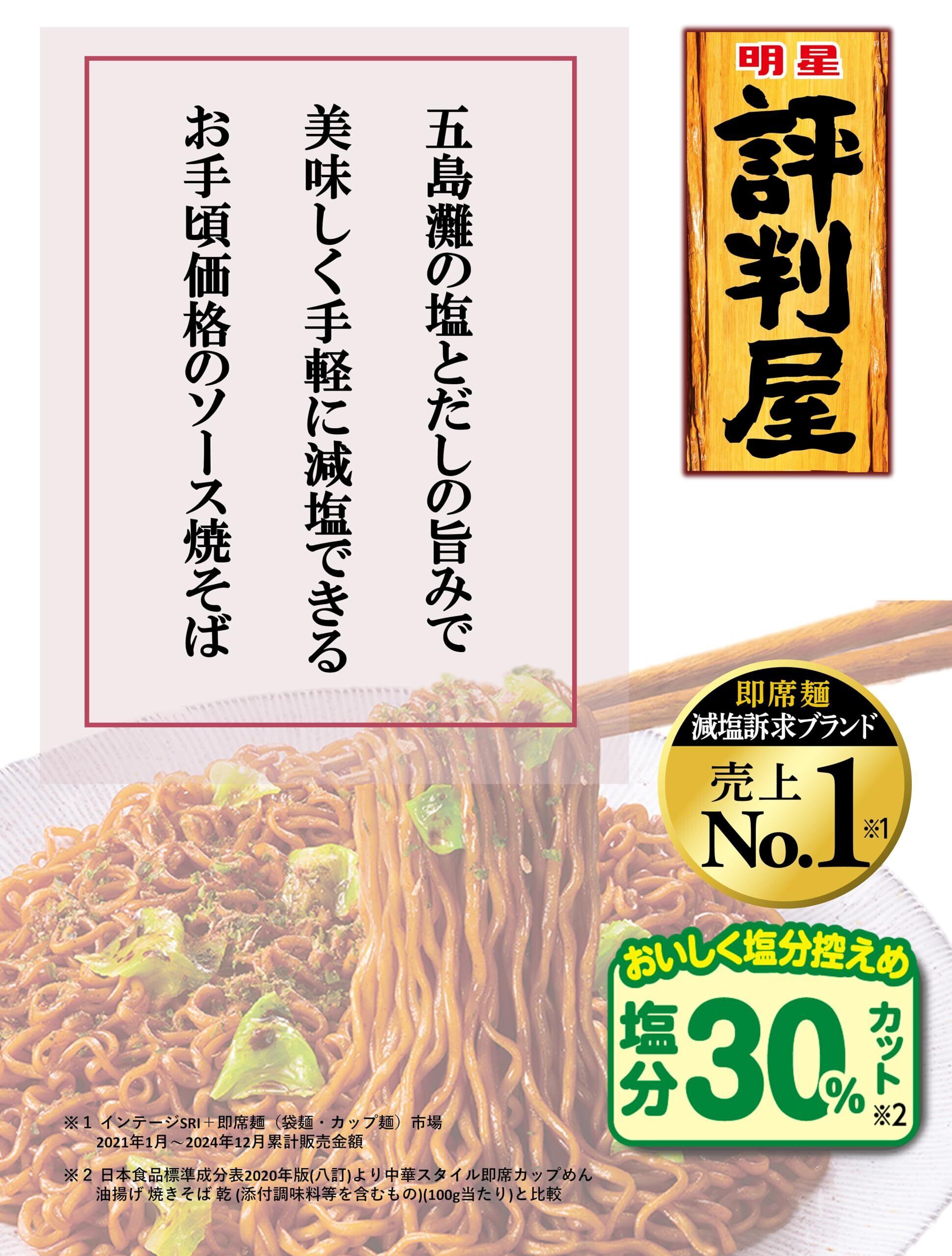 ●美味しく減塩できるお手軽価格の即席ラーメン。即席麺減塩訴求ブランド売上No.1(※1)の「評判屋」。減塩30%(※2)カットを実現しました。※1:インテージSRI+即席めん(袋麺・カップ麺)市場 2020年1月~2023年12月累計販売金額。※2:日本食品標準成分表2020年版(八訂)より 中華スタイル即席カップめん 油揚げ 焼きそば 乾 (添付調味料等を含むもの)(100g当たり)と比較。●ソースは旨み引き立つ五島灘の塩を配合。ビーフと鰹の旨みにシナモン・コリアンダーなどの香辛料を合わせました。ふりかけは、青さ、紅生姜、ソースパウダー、にんにく、黒胡椒。かやくは、キャベツ。